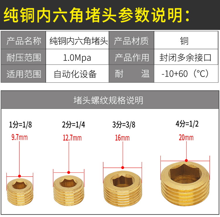| Color Options | British Standard 1/8 Iron Plug (1/8 inch), British Standard 1/4 Iron Plug (1/4 inch), British Standard 3/8 Iron Plug (3/8 inch), British Standard 1/2 Iron Plug (1/2 inch), British Standard 3/4 Iron Plug (3/4 inch), British Standard DN25 Iron Plug (1 inch), British Standard 1/8 Copper Plug (1/8 inch), British Standard 1/4 Copper Plug (1/4 inch), British Standard 3/8 Copper Plug (3/8 inch), British Standard 1/2 Copper Plug (1/2 inch), British Standard 3/4 Copper Plug (3/4 inch) |