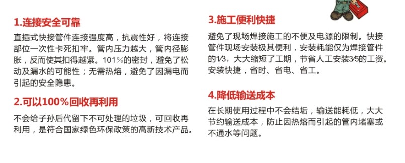 随着科技发展,发达国家逐渐淘汰了焊接而改用直插式连接方法,使管道内残留焊剂无法得到有效清洗,同时也保障了管道的流量全通径。是符合环保、低碳、健康的饮水需求卫生性能符合国家GB/T17219-1998标准。