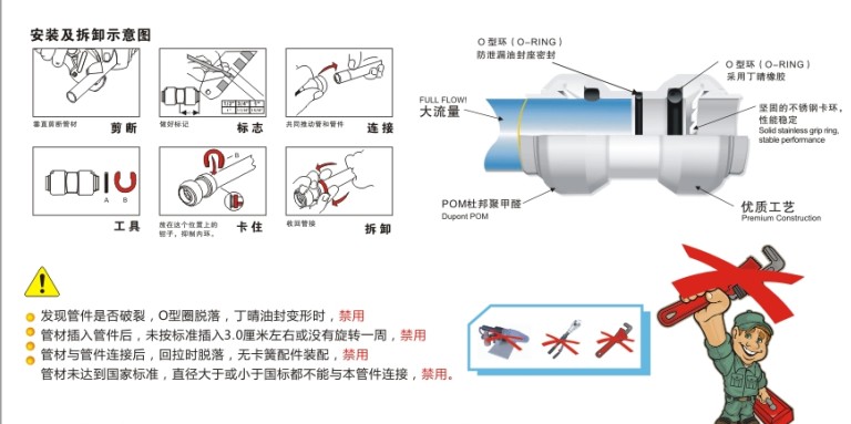 店主:肯定是比普通的PPR管件要贵。我们这个产品主要原材料是采用美国杜邦进口的POM,POM中文名叫聚甲醛,又称赛钢、特钢,类似于金属的强度和硬度。它具有防冻、抗压耐磨、耐高温和抗紫外线等物理特性,原材料的价格是PPR的两倍,我们两个316不锈钢卡环就要1块钱左右,够买一个便宜的PPR接头,我们这4个密封圈要1.5元左右。因为我们是最早研发者,就要用最好的零配件,如果我们一开始只图便宜,用普通材料做,那岂不是拿石头砸自己的脚,否则也不叫什么新产品。你说对不对?具体价格你可以看一下我们的价格表,其实算起来我们的管件跟日丰,伟星,金德,金牛等管件价格相差不大,但我们管件安装更便利,无需专业人员维修。讲究的是劳动效率,国家也是大力提倡转型升级嘛?同时也符合国家产业政策。
