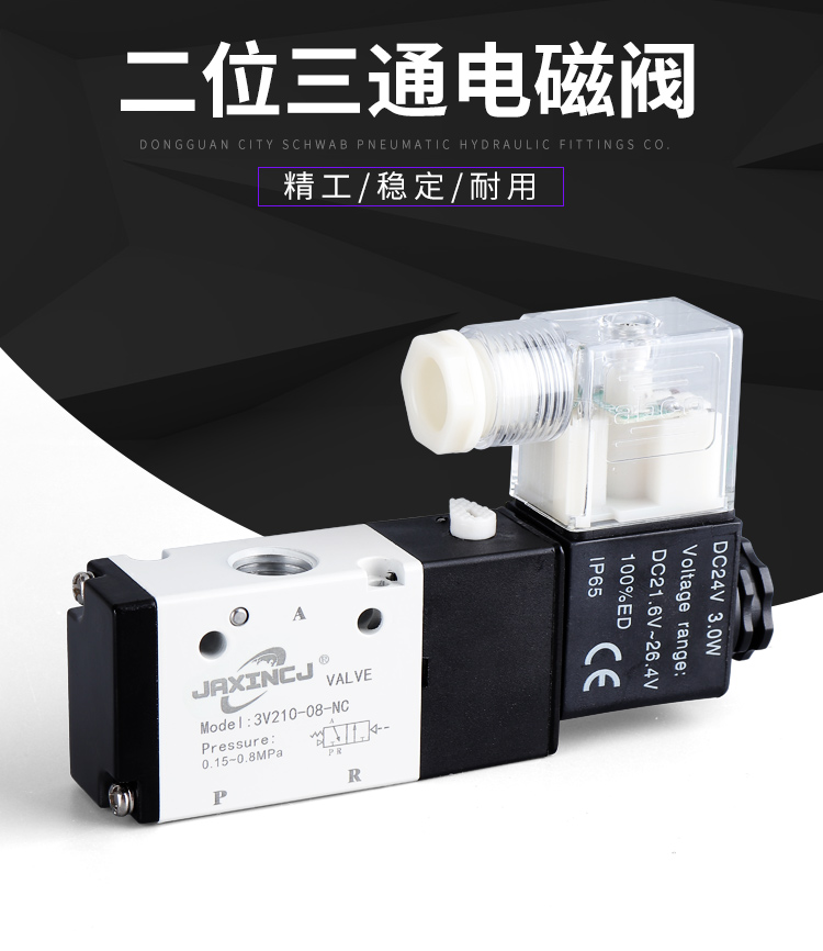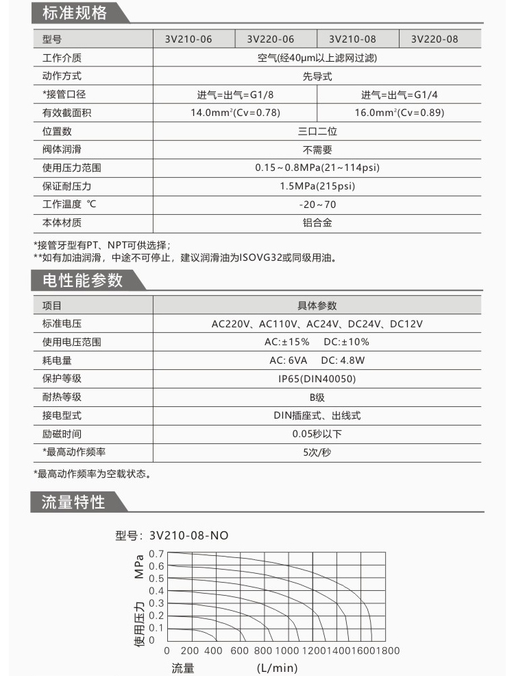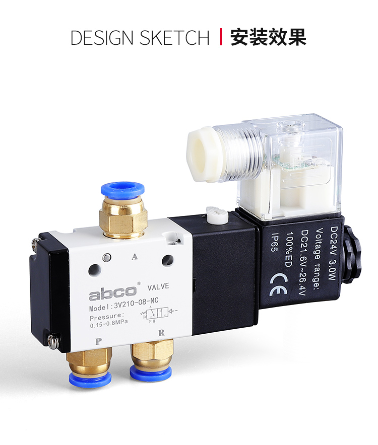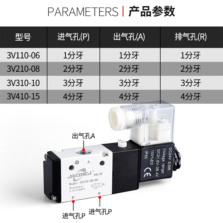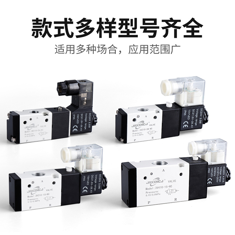 | Color Options | Solenoid valve 3V110-06/AC220V, Solenoid valve 3V110-06/DC24V, Solenoid valve 3V110-06/DC12V, Solenoid valve 3V210-08/Valve body without coil, Solenoid valve 3V210-08/AC220V, Solenoid valve 3V210-08/DC24V, Solenoid valve 3V210-08/DC12V, Solenoid valve 3V310-10/AC220V, Solenoid valve 3V310-10/DC24V, Solenoid valve 3V410-15/AC220V, Solenoid valve 3V410-15/DC24V |