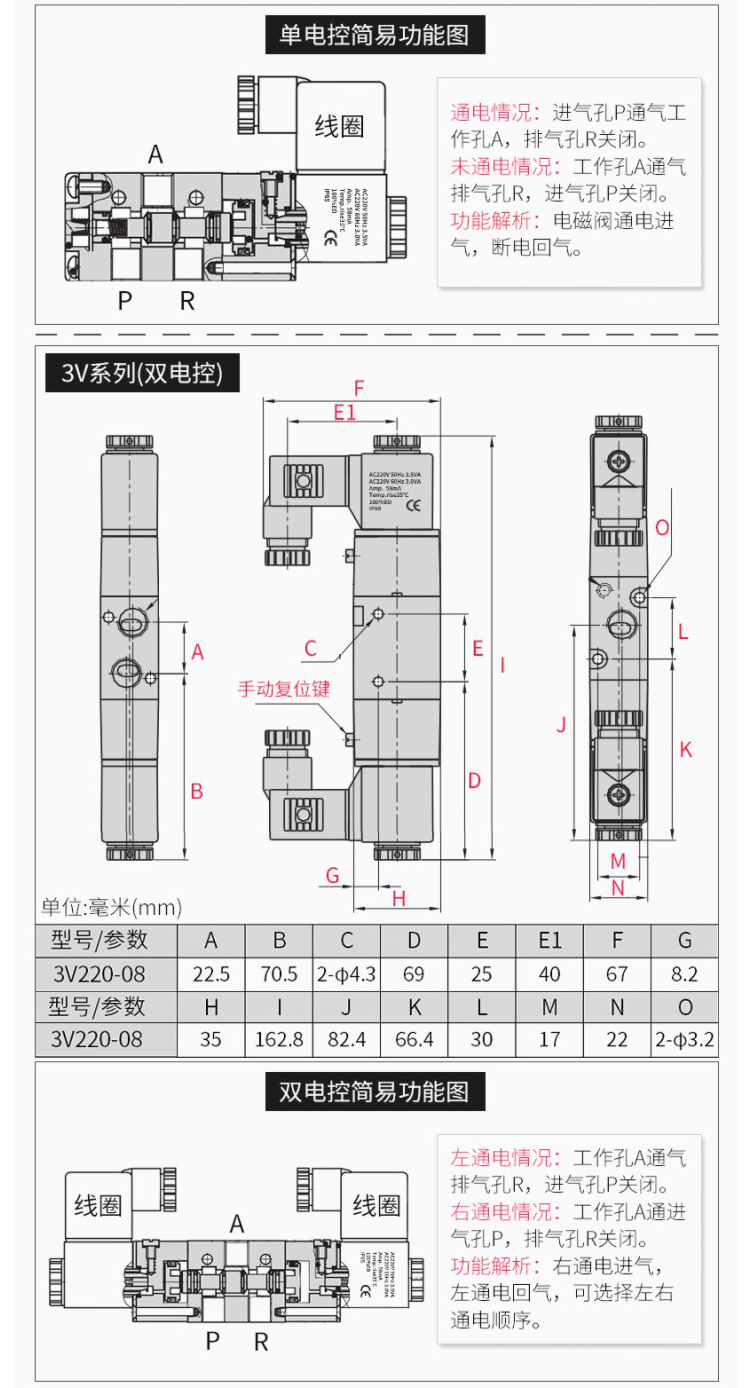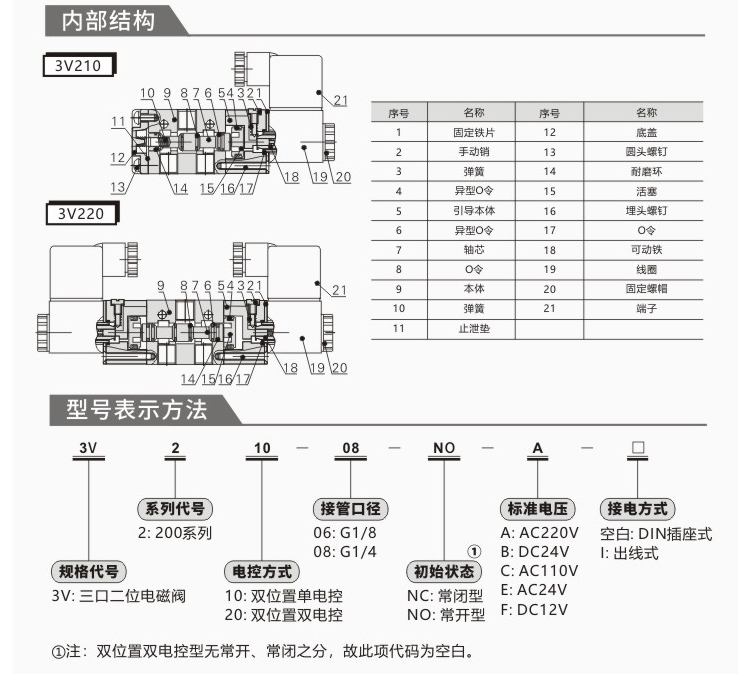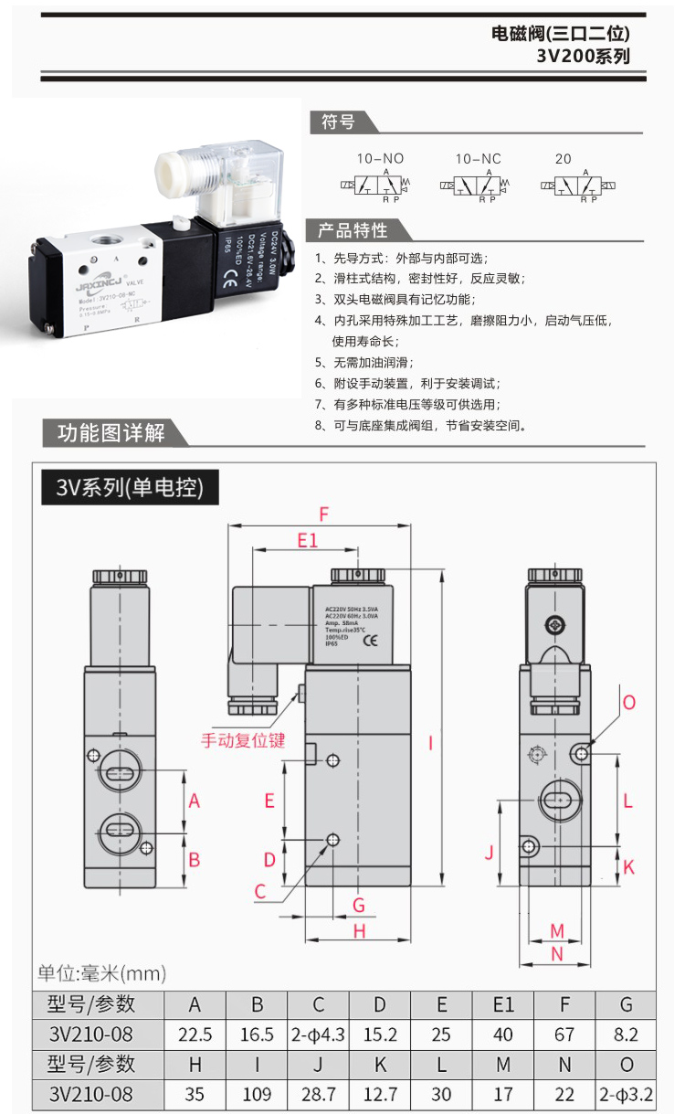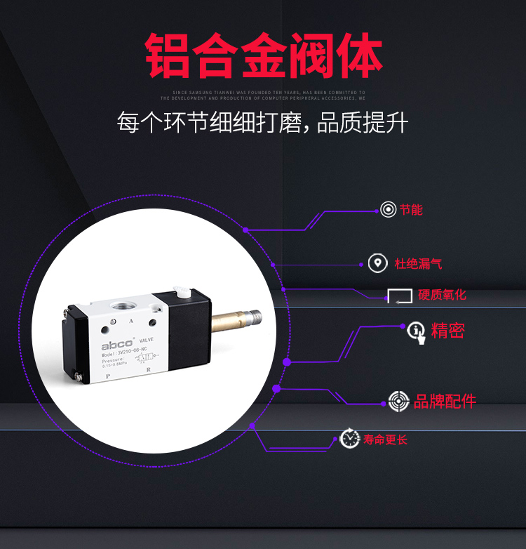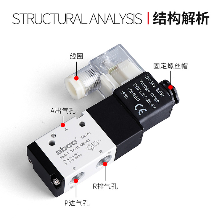 | Color Options | Solenoid valve 3V110-06/AC220V, Solenoid valve 3V110-06/DC24V, Solenoid valve 3V110-06/DC12V, Solenoid valve 3V210-08/Valve body without coil, Solenoid valve 3V210-08/AC220V, Solenoid valve 3V210-08/DC24V, Solenoid valve 3V210-08/DC12V, Solenoid valve 3V310-10/AC220V, Solenoid valve 3V310-10/DC24V, Solenoid valve 3V410-15/AC220V, Solenoid valve 3V410-15/DC24V |