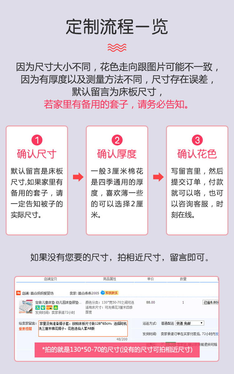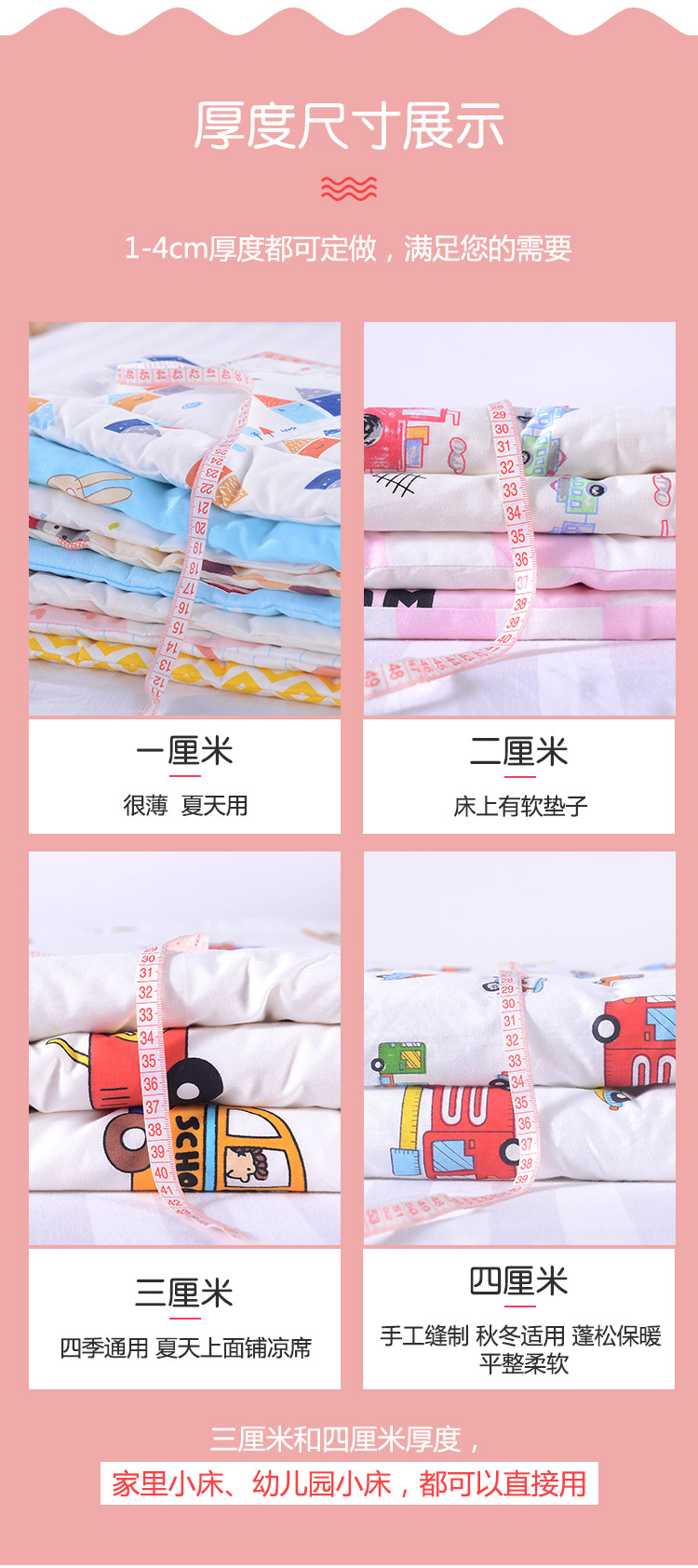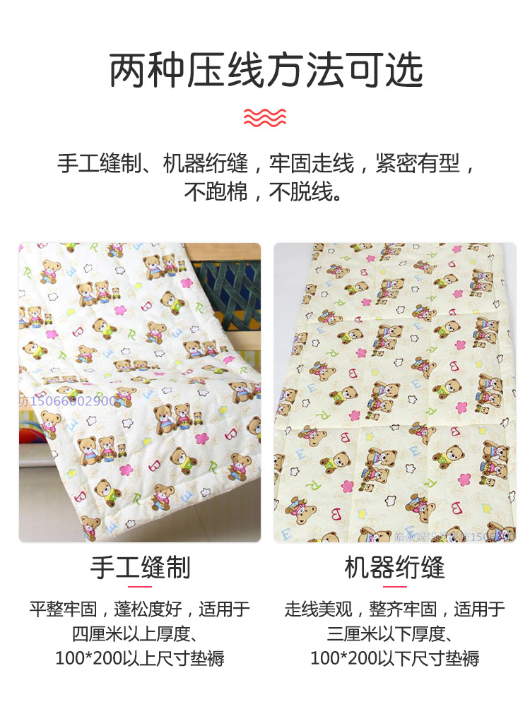 | Подходящие размеры кровати | 1 см хлопок - летняя тонкая версия, машинная стирка; 2 см хлопок - весна/осень, машинная стирка; 3 см хлопок - всесезонный вариант, машинная стирка; 4 см хлопок - зимний, ручная строчка, машинная стирка; 1 см шелковая вата - летняя тонкая версия, машинная стирка; 2 см шелковая вата - весна/лето, машинная стирка; 3 см шелковая вата - всесезонный, машинная стирка; 4 см шелковая вата - зимний, ручная строчка, машинная стирка |