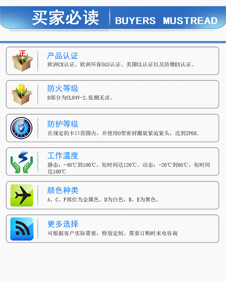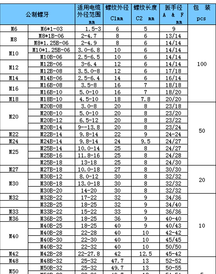 | Цветовые варианты | M8*1 (Диаметр провода 2-5мм), M10*1.5 (3-6мм), M12*1.5 (3-6мм), M12*1.5 (4-8мм), M14*1.5 (3-6мм), M14*1.5 (Фиксирующий провод 4-8мм), M16*1.5 (4-8мм), M16*1.5 (6-10мм), M18*1.5 (6-10мм), M20*1.5 (4-8мм), M20*1.5 (6-10мм), M20*1.5 (8-12мм), M20*1.5 (10-14мм), M22*1.5 (10-14мм), M24*1.5 (6-10мм), M24*1.5 (10-14мм), M25*1.5 (10-14мм), M25*1.5 (9-16мм), M25*1.5 (13-18мм), M27*1.5 (13-18мм), M30*1.5/2 (13-18мм), M32*1.5 (15-22мм), M32*1.5 (18-25мм), M36*1.5 (18-25мм), M40*1.5 (18-25мм), M40*1.5 (22-28мм), M40*1.5 (25-32мм), M50*1.5 (25-32мм), M50*1.5 (32-38мм), M42*2 (22-28мм) |