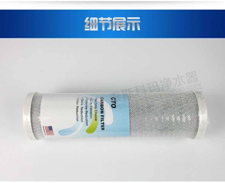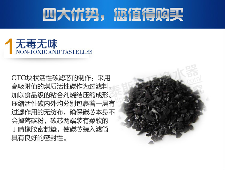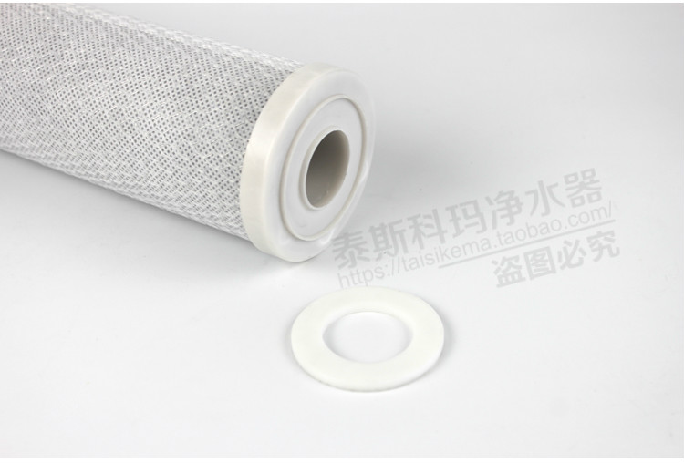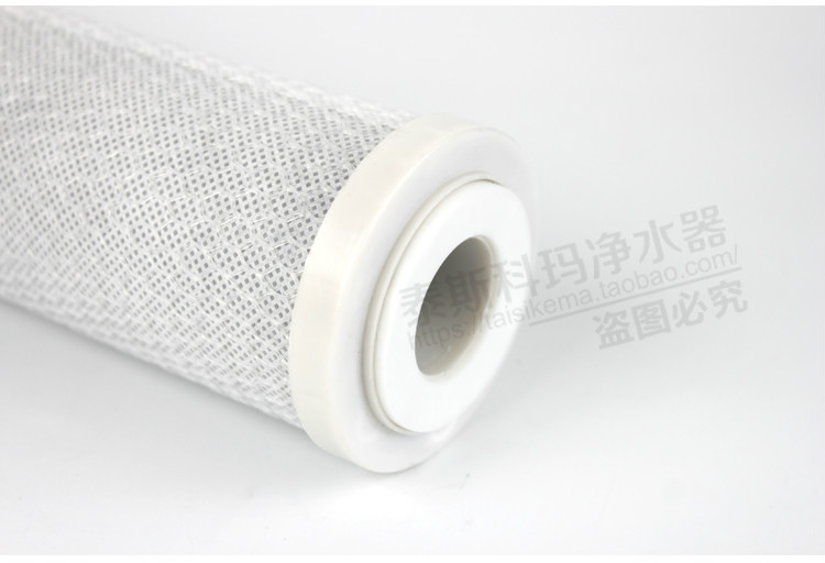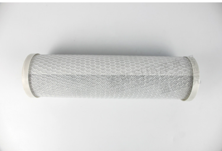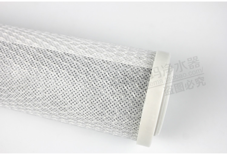 2、CTO块状活性碳滤芯的制作:采用高吸附值的煤质活性碳作为过滤料,加以食品级的粘合剂烧结压缩成形。压缩活性碳内外均分别包裹着一层有过滤作用的无纺布,确保碳芯本身不会掉落碳粉,碳芯两端装有柔软的丁晴橡胶密封垫,使碳芯装入滤筒具有良好的密封性。