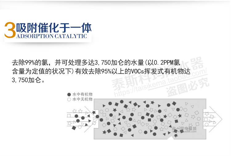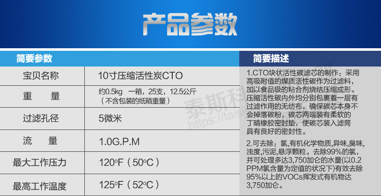 可去除:氯,有机化学物质,异味,臭味,浊度,污泥,悬浮颗粒。去除99%的氯,并可处理多达3,750加仑的水量(以0.2PPM氯含量为定值的状况下)有效去除95%以上的VOCs挥发式有机物达3,750加仑。