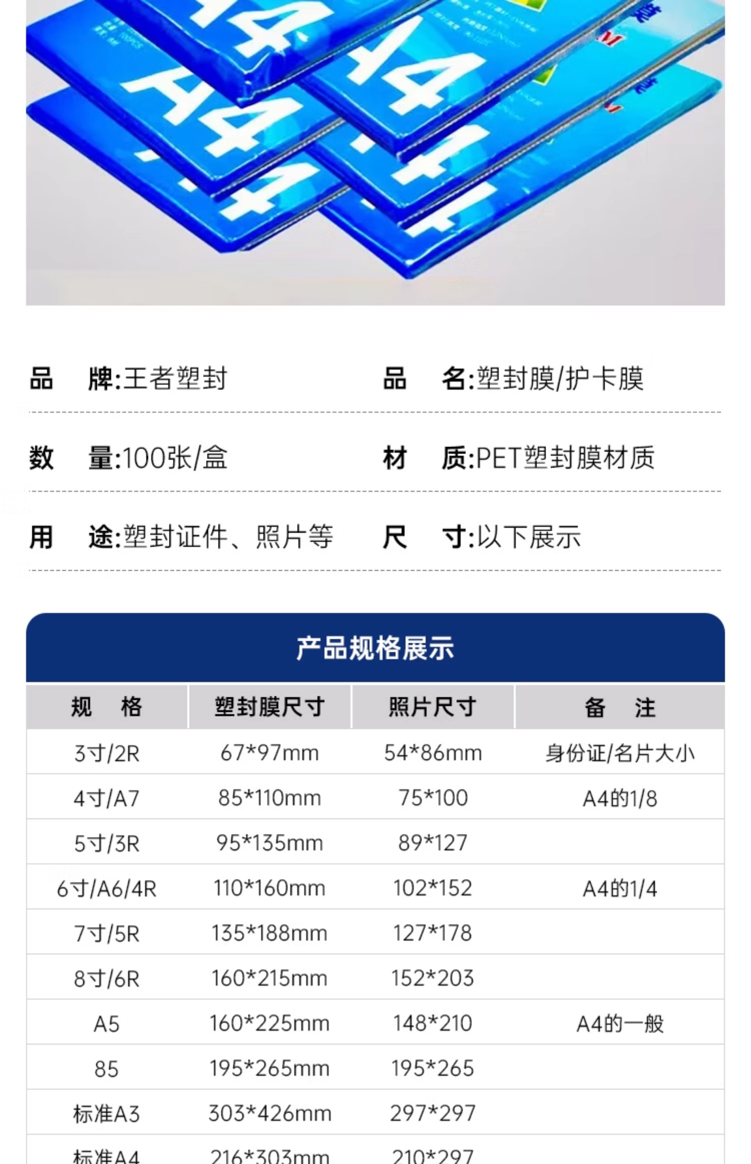| Цветовые варианты | Ламинационная пленка A4 5 микрон, 100 листов; A4 6 микрон, 100 листов; A4 7 микрон, 100 листов; A4 8 микрон, 100 листов; A4 9 микрон, 100 листов; A4 10 микрон, 100 листов; A4 12 микрон, 100 листов; A4 15 микрон, 100 листов; A4 20 микрон, 100 листов; Ламинационная пленка A3 5 микрон, 100 листов; A3 6 микрон, 100 листов; A3 7 микрон, 100 листов; A3 8 микрон, 100 листов; A3 9 микрон, 100 листов; A3 10 микрон, 100 листов; A3 12 микрон, 100 листов; Ламинационная пленка 3 дюйма 12 микрон, 2 упаковки 200 листов; Ламинационная пленка с перфорацией 3 дюйма 12 микрон, 2 упаковки 200 листов; Ламинационная пленка 5 дюймов 7 микрон, 2 упаковки 200 листов; Ламинационная пленка 6 дюймов 7 микрон, 3 упаковки 300 листов; Ламинационная пленка 7 дюймов 7 микрон, 2 упаковки 200 листов; Ламинационная пленка 8 дюймов 7 микрон, 100 листов; Ламинационная пленка A3 15 микрон, 100 листов; Ламинационная пленка A4 12,5 микрон, 100 листов |
