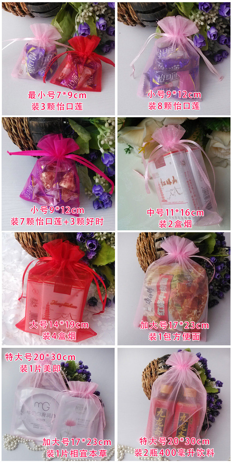 ***强调:纱袋是手工缝制,个别抽丝开线或尺寸偏差问题在所难免,配花、抽绳及颜色不同尺寸不同批次也会略有差别,介意的朋友请向客服咨询清楚再拍!~本款纱袋所用的是优质纱,细密有光泽,照片上基本看不出网孔!~~