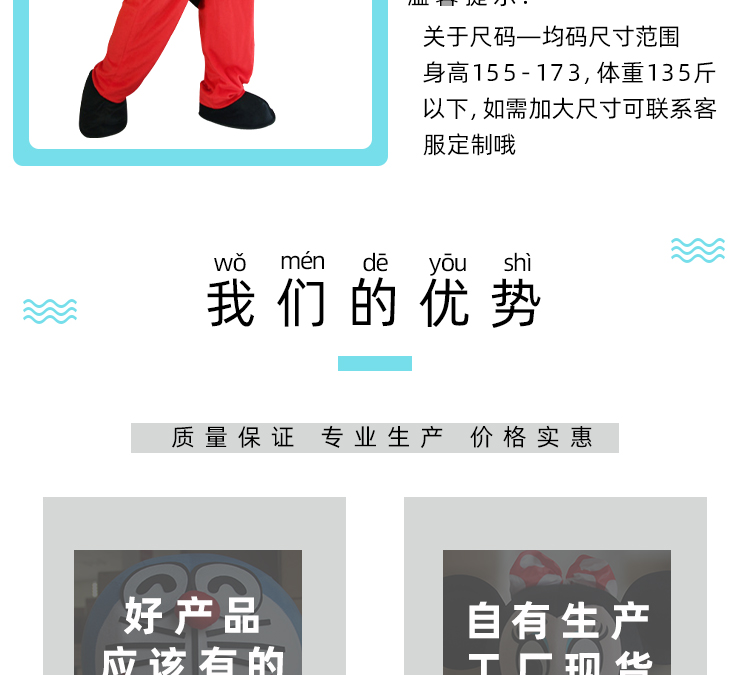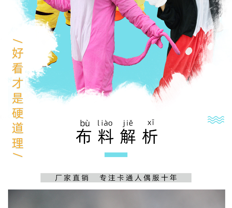 | Цветовые варианты | Обезьяна мужской, Тан мужской, Микки мужской, Большая панда, Обезьяна женский, Тан женский, Минни женский (размер маломерит, заказывайте на один размер больше), Тигруля, Маленькая желтая уточка, Красный тигр Amway, Робот мужской, Винни-Пух, Робот-кот женский, Морской Микки мужской, Длинношерстная панда, Гарфилд, Серый Кролик Багз, Морская Минни женский (размер маломерит, заказывайте на один размер больше), Серый кот, Коричневая мышь, Розовый Кролик Багз, Тигр Amway, Маленькая панда, Травянисто-зеленый дракон |