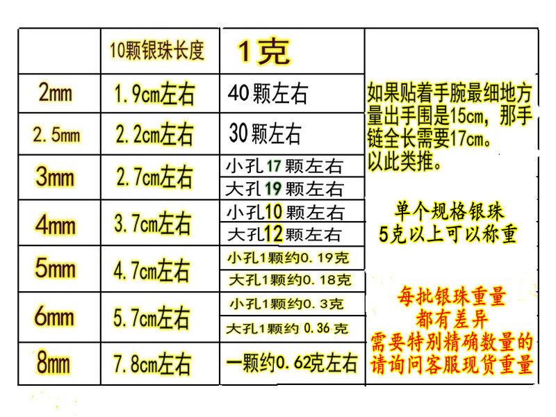 | Цветовые варианты | 2мм (отверстие 0,8мм) 10 шт., 2,5мм (отверстие 1мм) 10 шт., 3мм (малое отверстие 1мм) 5 шт., 3мм (большое отверстие 1,2мм) 5 шт., 4мм (большое отверстие 1,8мм) 2 шт., 4мм (малое отверстие 1,5мм) 2 шт., 5мм (большое отверстие 2мм) 1 шт., 5мм (малое отверстие 1,5мм) 1 шт., 6мм (малое отверстие 1,5мм) 1 шт., 6мм (большое отверстие 2,5мм) 1 шт., 8мм (отверстие 1,8мм) 1 шт., Минимальная оптовая партия 5 г (без смешивания веса, 8мм не взвешиваются по граммам) |
