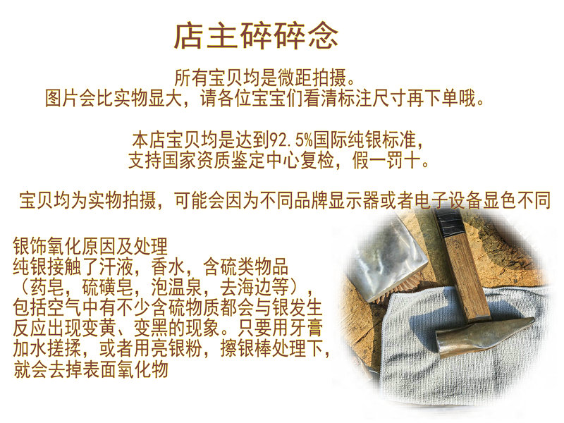 1)看颜色测试:纯度愈高,银色愈洁白,面档细腻均匀发 亮,有润色。如果含铅质,面档发出潮花带有青灰色;如含铜质,面档出现粗糙及烂心,有干燥感。被氧化了的白银尽管表面有“黑锈”,但其色泽黑而呈光亮。铅、锡、白铜则没有光泽,其色发暮。