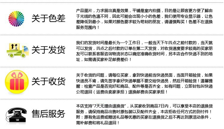 四、诚信是卖家的传统,理解是买家的美德。任何问题都可以协商,有任何问题都可以解决。对所购的产品有任何问题,及时联系我们,我们将及时帮您解决。
