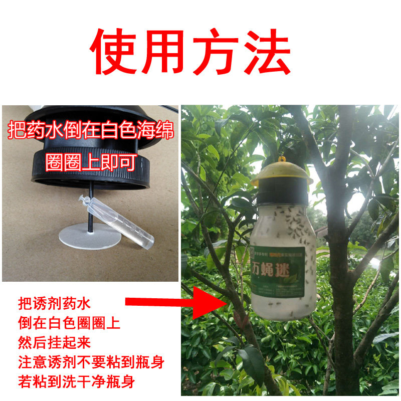使用方法是:每次用2毫升的引诱剂滴于诱捕器的芯板上,盖上盖后挂于果园中,根据果树的大小或害虫的情况,每亩挂6-8个诱捕器,隔20-30天左右补充一次引诱剂即可。