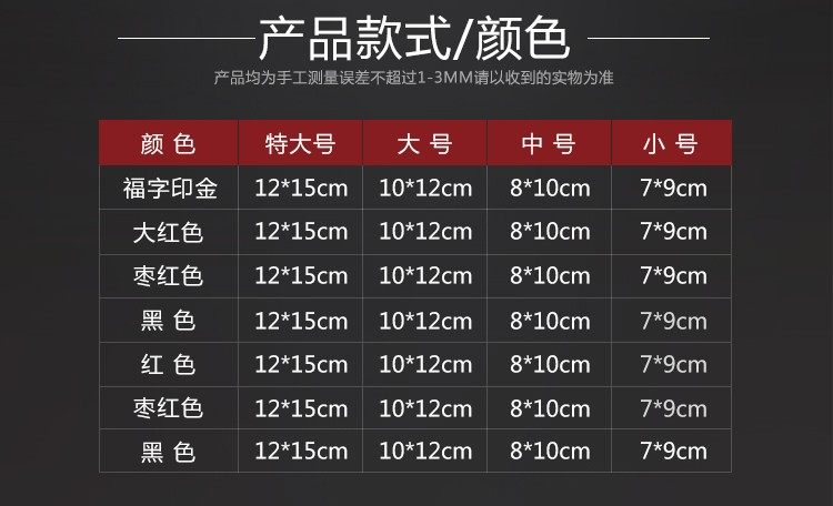 | Цветовые варианты | Черный, Темно-серый, Красный с золотой отделкой маленький 9.5*7 см, Красный с золотой отделкой средний 10*8 см, Красный с золотой отделкой большой 12*10 см, Красный с золотой отделкой очень большой 15*12 см, Бордовый с золотой отделкой маленький 9.5*7 см, Бордовый с золотой отделкой средний 10*8 см, Бордовый с золотой отделкой большой 12*10 см, Бордовый с золотой отделкой очень большой 15*12 см, Черный с золотой отделкой маленький 9.5*7 см, Черный с золотой отделкой средний 10*8 см, Черный с золотой отделкой большой 12*10 см, Черный с золотой отделкой очень большой 15*12 см, Символ «Фу» маленький 9*7 см, Символ «Фу» средний 10*8 см, Символ «Фу» большой 12*10 см, Символ «Фу» очень большой 16*12 см, Полностью красный маленький 9*7 см, Полностью красный средний 10*8 см, Полностью красный большой 15*11 см, Полностью красный очень большой 19*11 см, Полностью черный №1 9*7 см, Полностью черный №2 10*8 см, Полностью черный №3 12*9 см, Полностью черный №4 14*9 см |