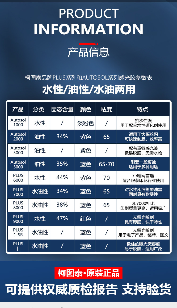 | Цветовые варианты | Кетчути 1000 водорастворимый светочувствительный клей (оригинал), Кетчути 2000 масляный светочувствительный клей (оригинал), Кетчути 3000 масляный светочувствительный клей (оригинал), Кетчути 5000 масляный светочувствительный клей (оригинал), Кетчути 6000 водорастворимый светочувствительный клей (оригинал), Кетчути 7000 водно-масляный светочувствительный клей (оригинал), Кетчути 8000 водно-масляный светочувствительный клей (оригинал), Кетчути 9000 водный светочувствительный клей для толстых пластин (оригинал), Кетчути PLUS2 водно-масляный светочувствительный клей (оригинал), Кетчути 1SR светочувствительный клей (оригинал), 7000 водно-масляный светочувствительный клей (отечественный), 7000 водно-масляный светочувствительный клей (импортный), 8000 водно-масляный светочувствительный клей (отечественный), 8000 водно-масляный светочувствительный клей (импортный) |