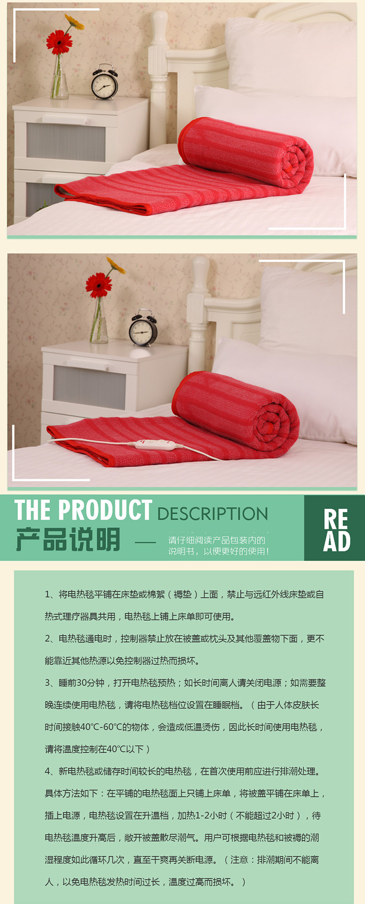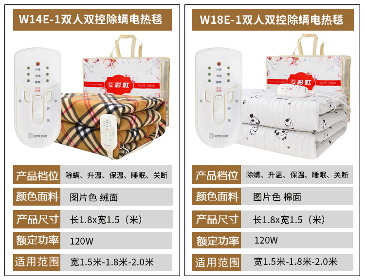 | Цветовые варианты | 1201 Односпальный 1.5х0.7м Нетканый материал; B0715H-43 Односпальный 1.5х0.7м Верблюжий цвет нетканого материала; B0818H-27-B Односпальный с таймером против клещей 1.8х0.8м Принтованный нетканый материал; Q1018F-27 Односпальный с таймером против клещей 1.8х1.0м Фланель; Q1018C-27-B Односпальный с таймером против клещей 1.8х1.0м Чистый хлопок; 1206 Двуспальный 1.5х1.2м Нетканый материал; B1215H-43-A Двуспальный 1.5х1.2м Верблюжий цвет нетканого материала; B1218H-31-B Двуспальный с таймером против клещей 1.8х1.2м Нетканый материал; B1316H-30 Двуспальный с таймером против клещей 1.6х1.3м Принтованный нетканый материал; B1518H-48 Двуспальный двойной контроль 1.8х1.5м Принтованный нетканый материал; B1820H-48 Двуспальный двойной контроль 2.0х1.8м Принтованный нетканый материал; 1336 Двуспальный одинарный контроль 1.8х1.7м Принтованный нетканый материал; B1518H-47 Двуспальный двойной контроль с таймером против клещей 1.8х1.5м Принтованный нетканый материал; B1820H-47 Двуспальный двойной контроль с таймером против клещей 2.0х1.8м Принтованный нетканый материал; Q1518F-32 Двуспальный двойной контроль с таймером против клещей 1.8х1.5м Фланель; Q1820F-32 Двуспальный двойной контроль с таймером против клещей 2.0х1.8м Фланель; Q1518C-32 Двуспальный двойной контроль с таймером против клещей 1.8х1.5м Односторонний чистый хлопок; Q1820C-32 Двуспальный двойной контроль с таймером против клещей 2.0х1.8м Односторонний чистый хлопок; Q1518C-32-A Двуспальный двойной контроль с таймером против клещей 1.8х1.5м Двусторонний утолщённый чистый хлопок; 1662 Двуспальный двойной контроль с таймером против клещей 1.8х1.5м Принтованный нетканый материал; 1661 Двуспальный двойной контроль с таймером против клещей 2.0х1.8м Принтованный нетканый материал; 1666 Двуспальный двойной контроль с таймером против клещей 1.8х1.5м Односторонний чистый хлопок; 1665 Двуспальный двойной контроль с таймером против клещей 2.0х1.8м Односторонний чистый хлопок; 1868 Двуспальный двойной контроль с таймером против клещей 1.8х1.5м Односторонний чистый хлопок; Q1518M-7 Двуспальный двойной контроль с таймером против клещей цифровой дисплей 1.8х1.5м Односторонний с начёсом; 1535 Двуспальный двойной контроль с таймером против клещей цифровой дисплей 2.0х1.8м Двусторонний утолщённый чистый хлопок; W19E-A Двуспальный двойной контроль с таймером против клещей цифровой дисплей 2.0х1.8м Двусторонний утолщённый чистый хлопок |
