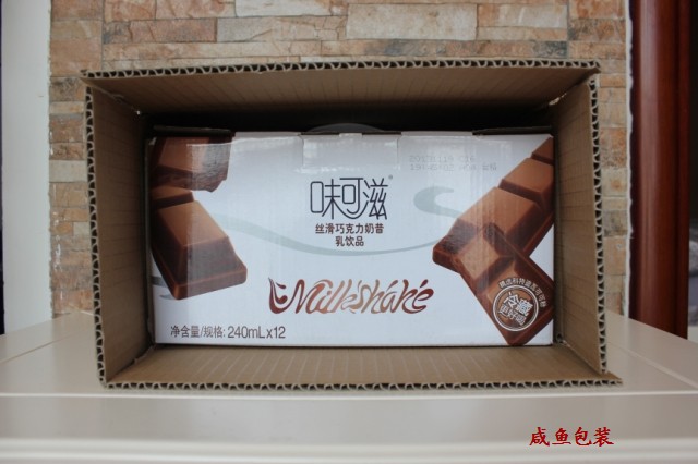 5号的纸箱,可以放一个伊利味可滋的牛奶箱(如下)