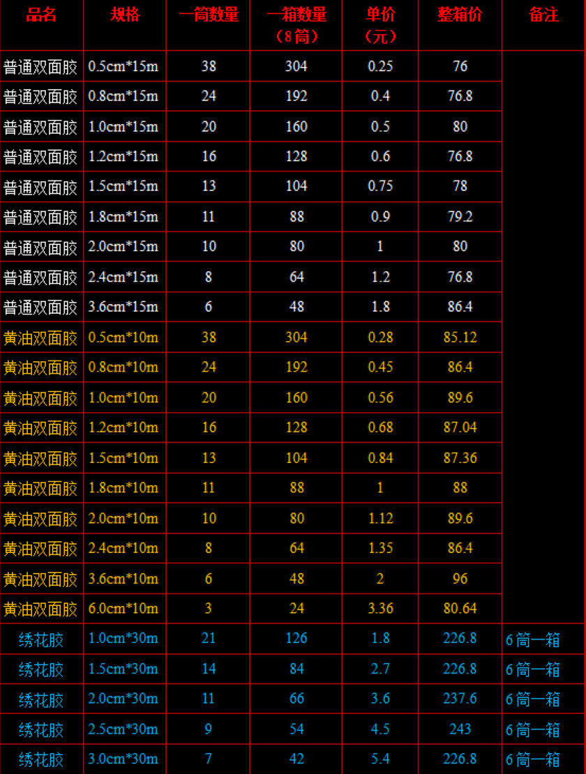| Цветовые варианты | Обычный белый 0.5см*15м, 38 шт; Обычный белый 0.8см*15м, 24 шт; Обычный белый 1.0см*15м, 20 шт; Обычный белый 1.2см*15м, 16 шт; Обычный белый 1.5см*15м, 13 шт; Обычный белый 1.8см*15м, 11 шт; Обычный белый 2.0см*15м, 10 шт; Обычный белый 2.4см*15м, 8 шт; Обычный белый 3.6см*15м, 6 шт; Масляный цвет 0.5см*10м, 38 шт; Масляный цвет 0.8см*10м, 24 шт; Масляный цвет 1.0см*10м, 20 шт; Масляный цвет 1.2см*10м, 16 шт; Масляный цвет 1.5см*10м, 13 шт; Масляный цвет 1.8см*10м, 11 шт; Масляный цвет 2.0см*10м, 10 шт; Масляный цвет 2.4см*10м, 8 шт; Масляный цвет 3.6см*10м, 6 шт; Масляный цвет 6.0см*10м, 3 шт; Масляный клей на масляной основе белый 2.5см*30м, 3 шт; Масляный клей на масляной основе белый 3.0см*30м, 2 шт; Масляный клей на масляной основе белый 1.5см*30м, 4 шт; Масляный клей на масляной основе белый 2.0см*30м, 3 шт; Масляный клей на масляной основе белый 1.0см*30м, 6 шт |