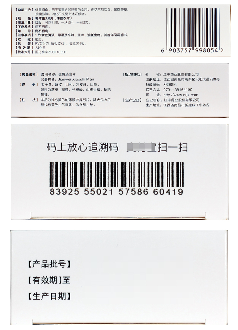 | Название продукта | 0,8 г * 32 таблетки х 1 коробка [Улучшение пищеварения, при застое пищи из-за слабости селезёнки и желудка] 0,8 г * 32 таблетки х 2 коробки [Для плохого аппетита, отрыжки с кислым и неприятным запахом] 0,8 г * 32 таблетки х 3 коробки [Для вздутия в области желудка и расстройств пищеварения] 0,8 г * 32 таблетки х 5 коробок [Прием: 3 таблетки за раз, 3 раза в день] |