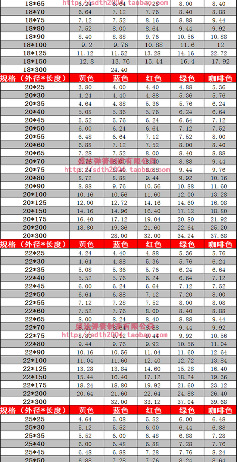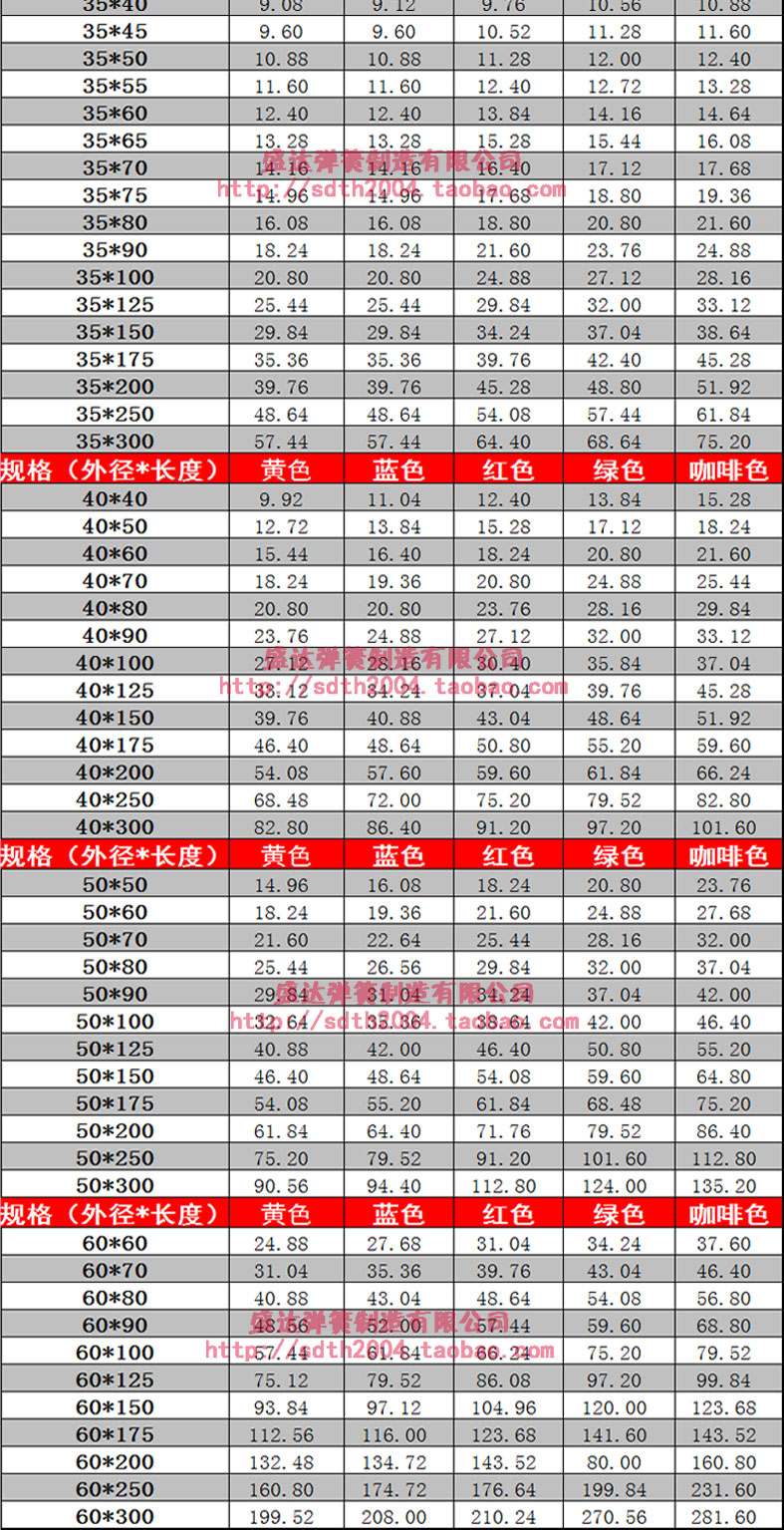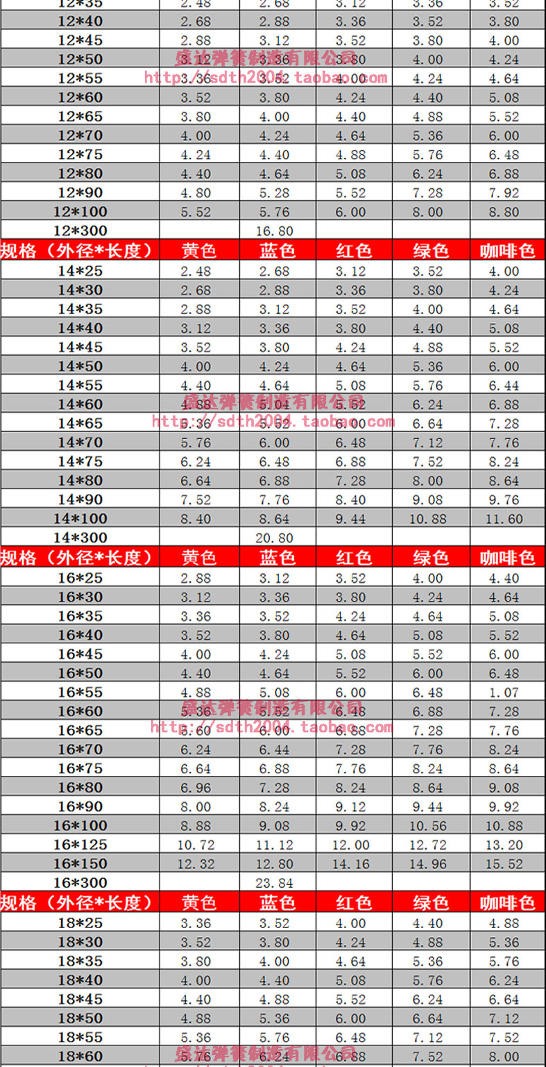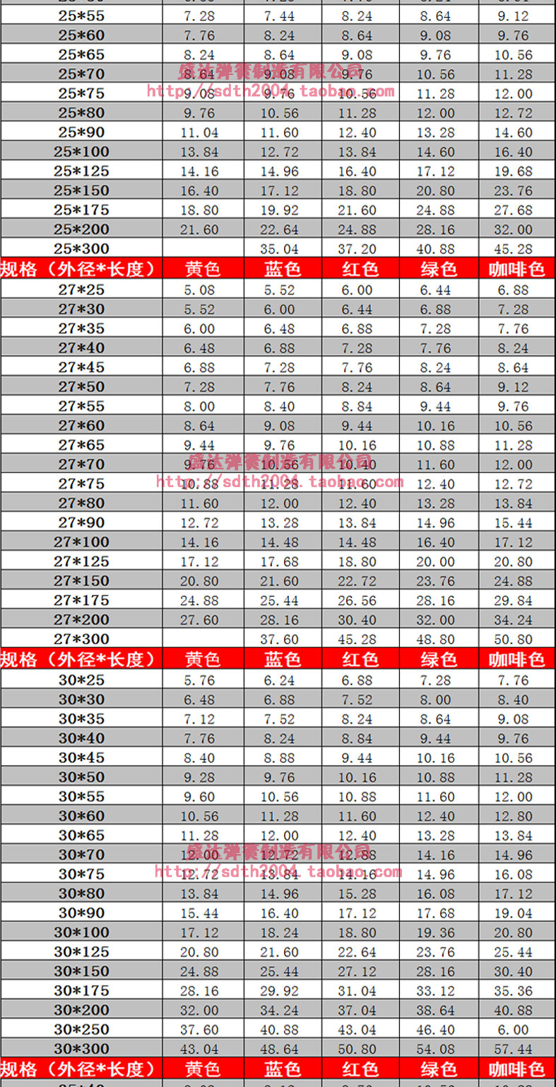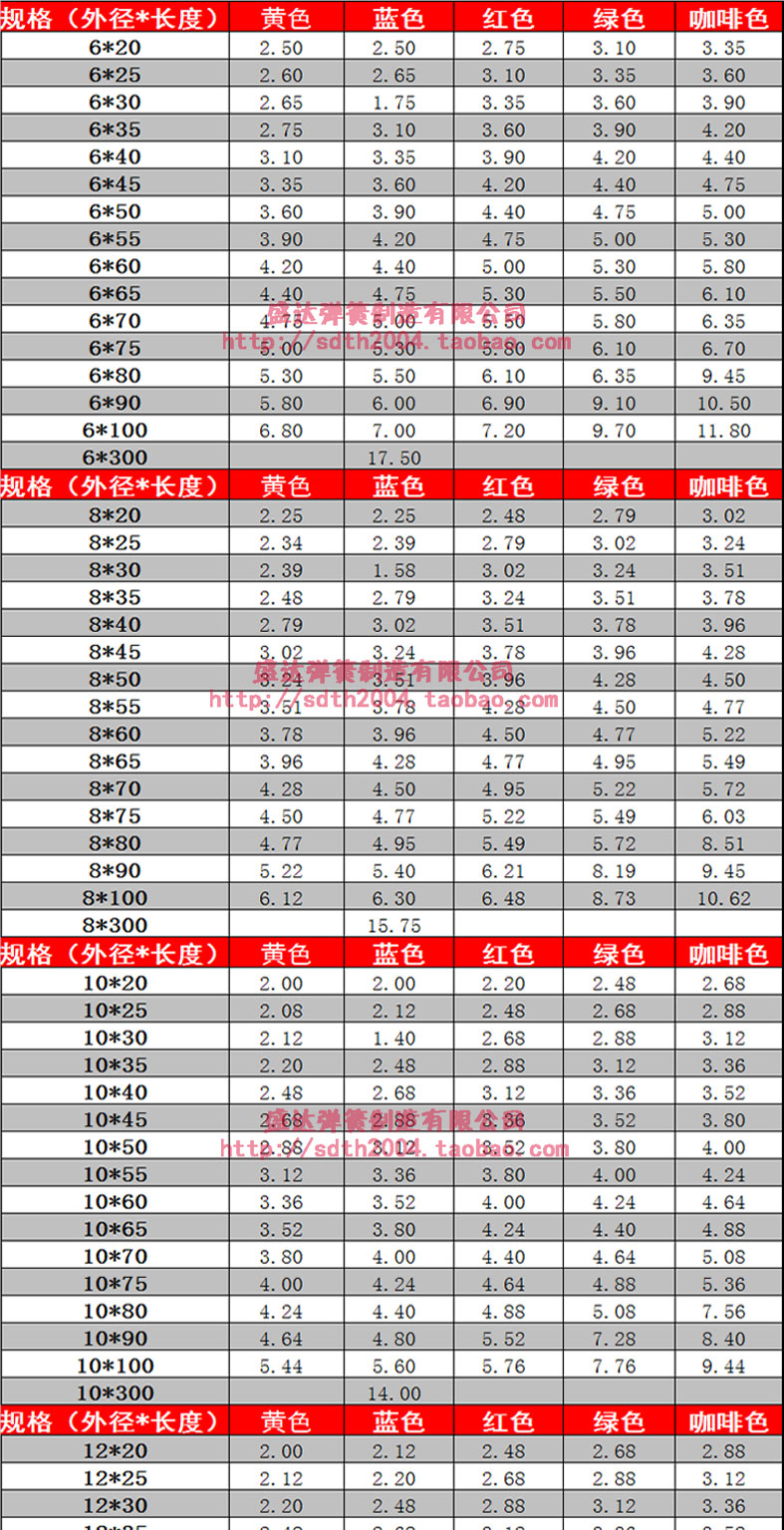| Цветовые варианты | Накладные доступны при покупке пружин на сумму от 39 юаней. Нажмите на варианты, чтобы просмотреть прайс-лист. После оформления заказа свяжитесь со службой поддержки для корректировки цены. Прайс-лист по внешним диаметрам: 6, 8, 10, 12, 14, 16, 18, 20, 22, 25, 27, 30, 35, 40, 50, 60. |