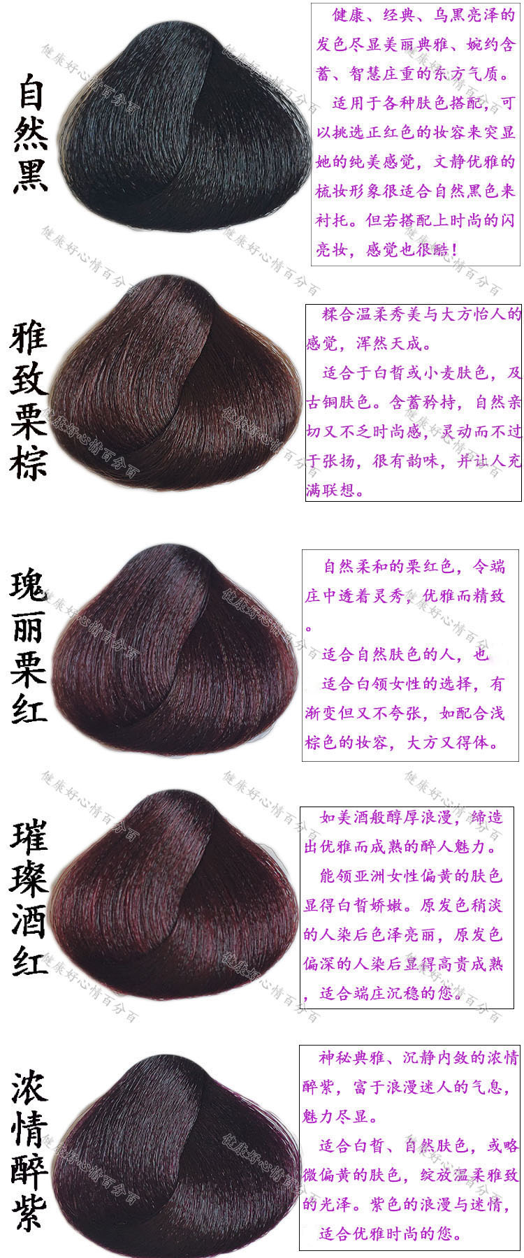 Цветовые варианты Естественный черный (120 г), Элегантный каштановый (120 г), Великолепный каштановый красный (яркая медь), Искрящийся винный красный, Насыщенный пурпурный