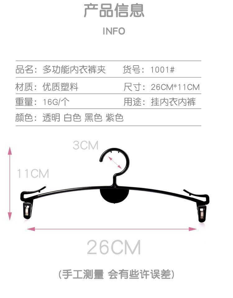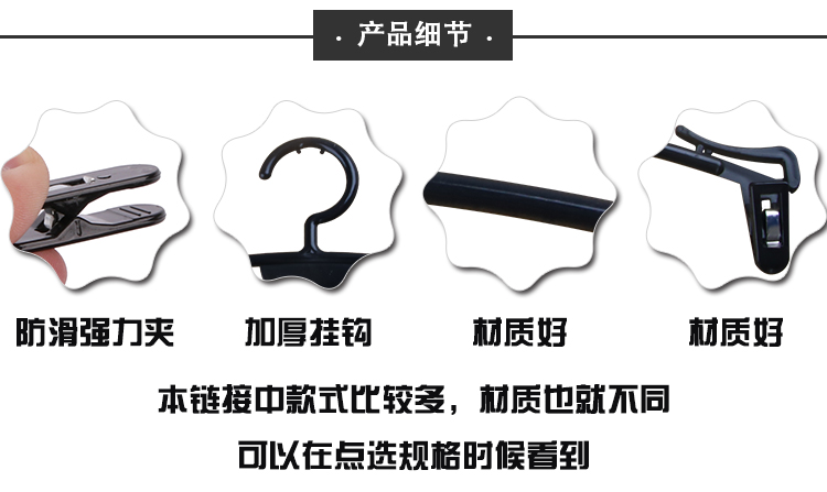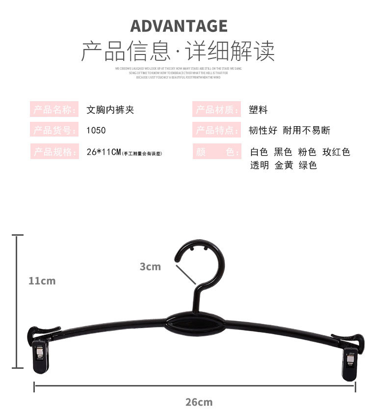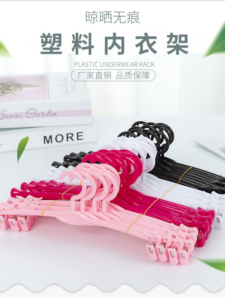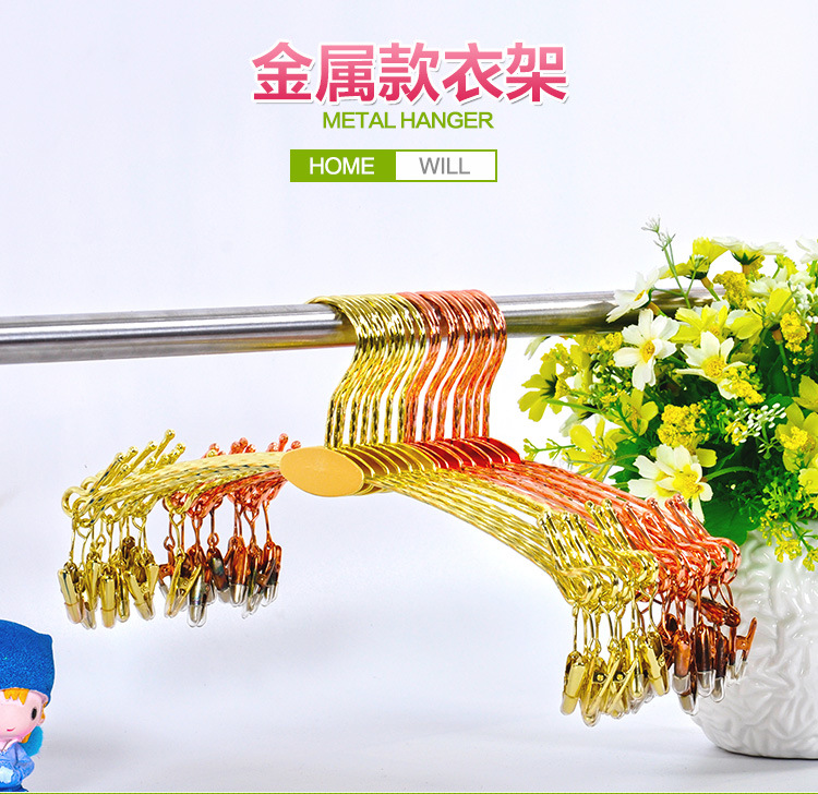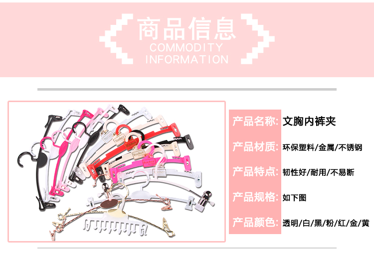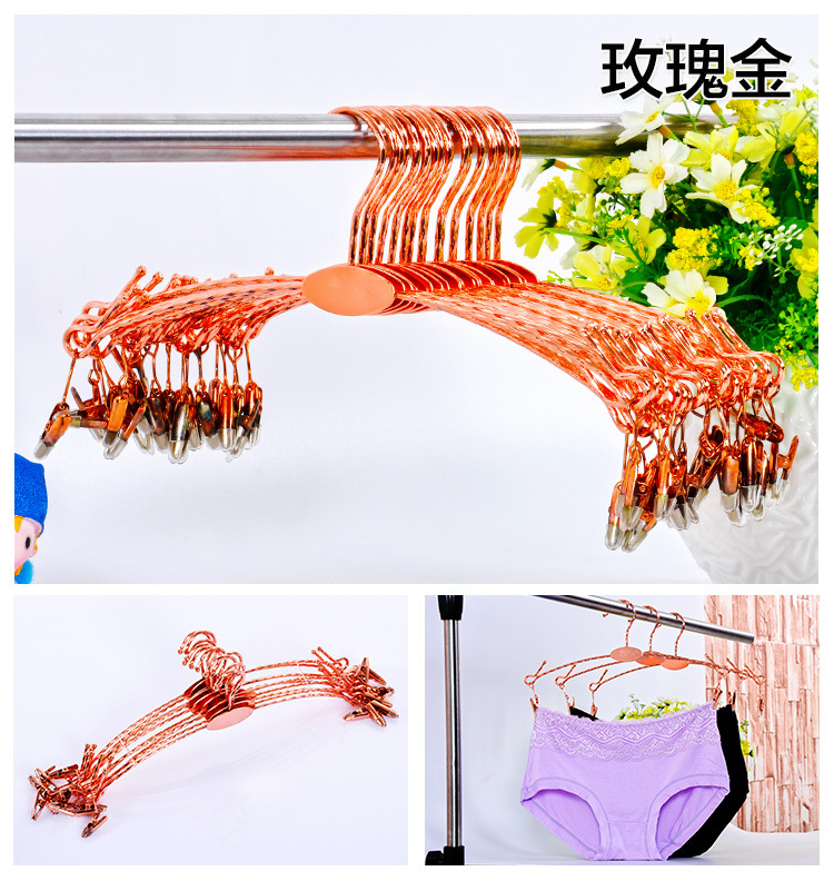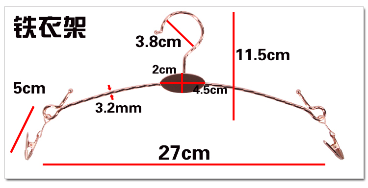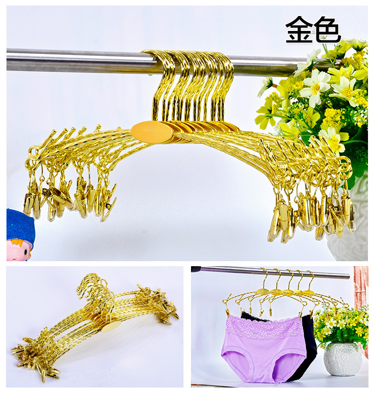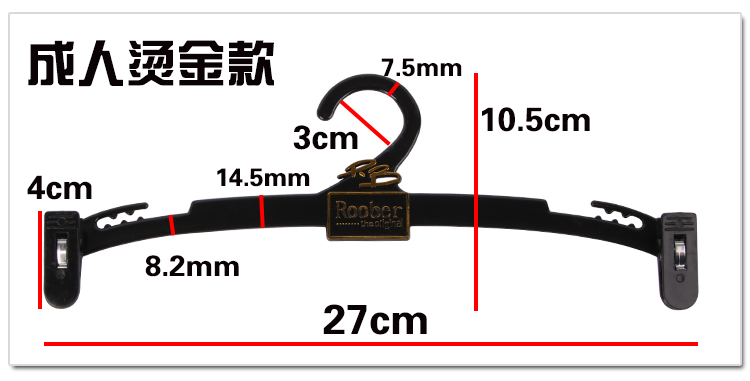 | Цветовые варианты | Универсальная модель - вешалка для трусов с гребневидной формой; Классическая прозрачная - взрослая; Классическая черная - взрослая; ABS белый - взрослый; ABS черный - взрослый; ABS красный - взрослый; ABS розовый - взрослый; Позолота - детская бежевая вешалка для нижнего белья; Позолота - детская черная вешалка для нижнего белья; Позолота - детская розовая вешалка для нижнего белья; Позолота - детская прозрачная вешалка для нижнего белья; Позолота - взрослая красная вешалка для нижнего белья; Позолота - взрослая бежевая вешалка для нижнего белья; Посеребрение - взрослая черная вешалка для нижнего белья; Позолота - взрослая прозрачная вешалка для нижнего белья; Универсальная модель - прозрачная мобильная вешалка для брюк; Железная вешалка - золотистая; Железная вешалка - розовое золото |