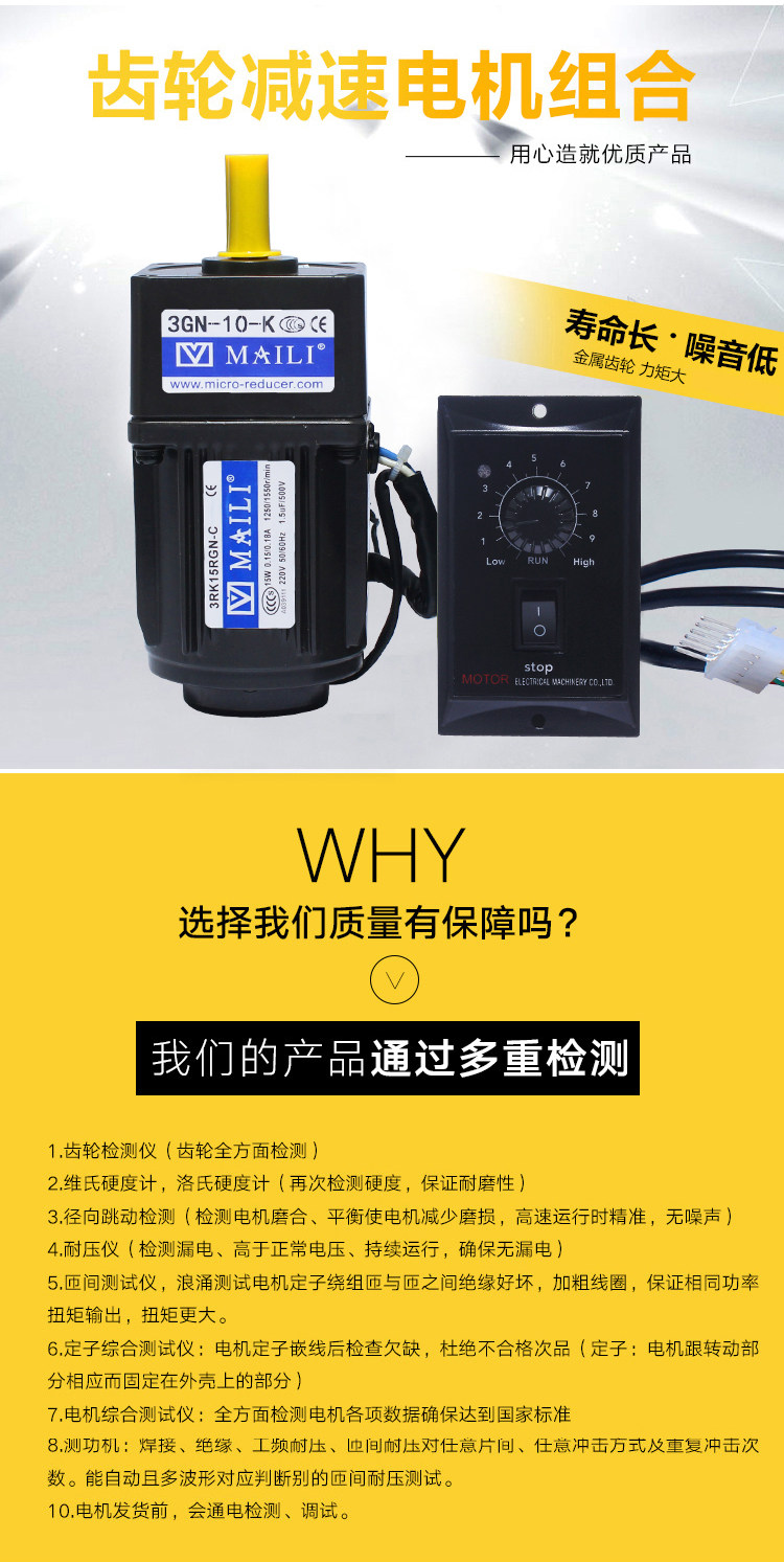 质保二年,七天包退,厂家直销,质量稳定可靠,采用国内数控机床 滚齿机 磨合部位全部通过热处理 使齿轮精度更高经久耐用 电机定子部位采用UL认证铜丝线 高端轴承 使电机噪声更低 功率更高 请准确选择正品产品,本产品已通过CE认证,SGS认证!已经向淘宝提交保证金,请放心购买!