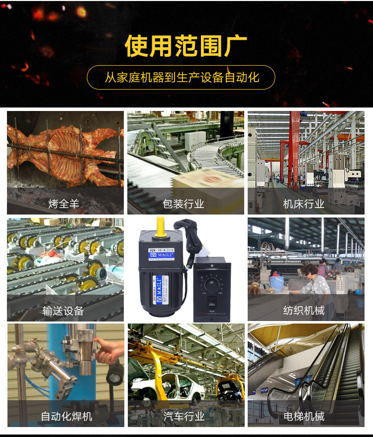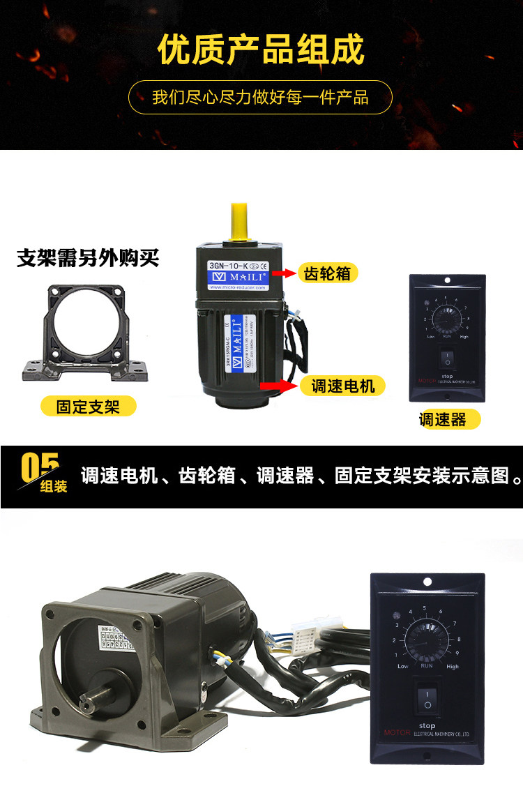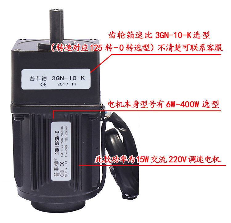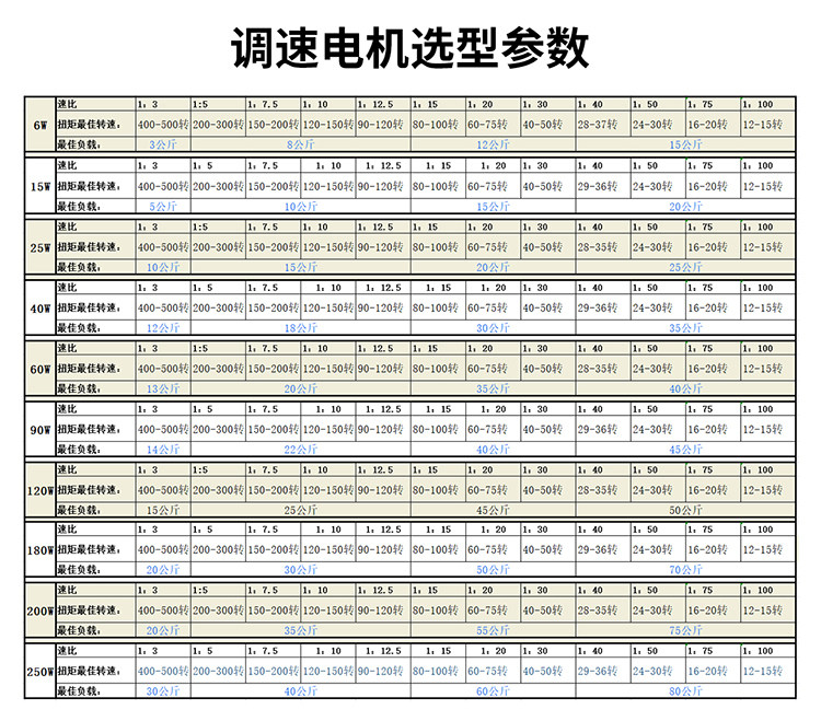 购物须知:在购买电机之前,先确定一分钟的转速,在我们的减速比选型表中选择最接近的转速。调速电机空载时,电机可以无极调速,速度可以从最大转速调到0为止,但电机装上设备,带了负载之后,请特别注意: