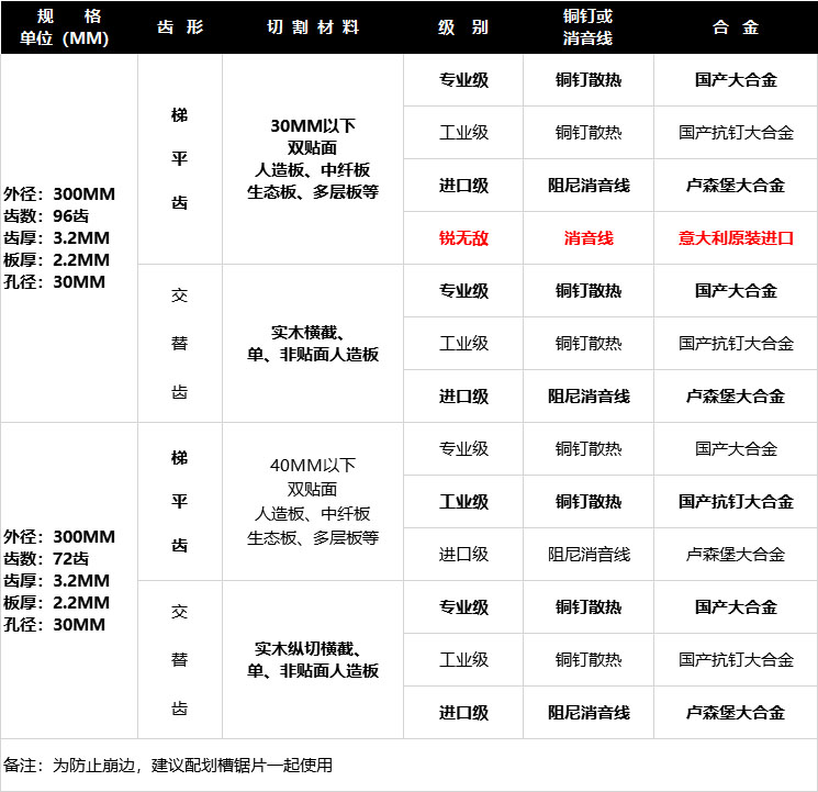| Цветовые варианты | Профессиональный класс: 96 зубьев - ступенчатые плоские зубья - охлаждение медными гвоздями, Профессиональный класс: 96 зубьев - ступенчатые плоские зубья - с шумоподавлением, Профессиональный класс: 96 зубьев - чередующиеся зубья - охлаждение медными гвоздями, Профессиональный класс: 72 зуба - ступенчатые плоские зубья - охлаждение медными гвоздями, Профессиональный класс: 72 зуба - чередующиеся зубья - охлаждение медными гвоздями, Профессиональный класс: 80 зубьев - ступенчатые плоские зубья - охлаждение медными гвоздями, Профессиональный класс: 80 зубьев - чередующиеся зубья - охлаждение медными гвоздями, Профессиональный класс 96 зубьев ступенчатые плоские зубья + одинарный паз диаметром 20, Профессиональный класс 96 зубьев ступенчатые плоские зубья + одинарный паз диаметром 22, Профессиональный класс 96 зубьев ступенчатые плоские зубья + двойной паз диаметром 20, Профессиональный класс 96 зубьев ступенчатые плоские зубья + двойной паз диаметром 22, Профессиональный класс: 96 зубьев - ступенчатые плоские зубья - экономичный вариант, Оригинальный импорт: 96 зубьев - ступенчатые плоские зубья - с шумоподавлением, Импортный класс: 96 зубьев - ступенчатые плоские зубья - с шумоподавлением, Импортный класс: 96 зубьев - чередующиеся зубья - с шумоподавлением, Импортный класс: 72 зуба - ступенчатые плоские зубья - с шумоподавлением, Импортный класс: 72 зуба - чередующиеся зубья - с шумоподавлением, Промышленный класс: 96 зубьев - ступенчатые плоские зубья - устойчивые к гвоздям, Промышленный класс: 96 зубьев - чередующиеся зубья - устойчивые к гвоздям, Промышленный класс: 72 зуба - ступенчатые плоские зубья - устойчивые к гвоздям, Промышленский класс: 72 зуба - чередующиеся зубья - устойчивые к гвоздям, Промышленный класс: 60 зубьев - чередующиеся зубья - устойчивые к гвоздям, Промышленный класс 96 зубьев ступенчатые плоские зубья + одинарный паз диаметром 20, Промышленный класс 96 зубьев ступенчатые плоские зубья + одинарный паз диаметром 22, Специальное предложение профессионального класса: одинарный паз диаметром 20, Специальное предложение профессионального класса: одинарный паз диаметром 22, Специальное предложение профессионального класса: двойной паз диаметром 20, Специальное предложение профессионального класса: двойной паз диаметром 22, Промышленный класс устойчивый к гвоздям: одинарный паз диаметром 20, Промышленный класс устойчивый к гвоздям: одинарный паз диаметром 22, Промышленный класс устойчивый к гвоздям: двойной паз диаметром 20, Промышленный класс устойчивый к гвоздям: двойной паз диаметром 22, Профессиональный класс экономичный вариант: одинарный паз диаметром 20 - бренд VSP, Профессиональный класс экономичный вариант: двойной паз диаметром 20, Профессиональный класс экономичный вариант: двойной паз диаметром 22, Промышленный класс: двойной паз диаметром 20 отверстие [наружный диаметр 100], Устойчивый к гвоздям: 96 зубьев ступенчатые плоские зубья + одинарный паз диаметром 20, Устойчивый к гвоздям: 96 зубьев ступенчатые плоские зубья + одинарный паз диаметром 22, Алмазный двойной паз диаметром 20, Алмазный двойной паз диаметром 22, Алмазная пила: 84 зуба - ступенчатые плоские зубья, Алмазная пила: 96 зубьев - ступенчатые плоские зубья |