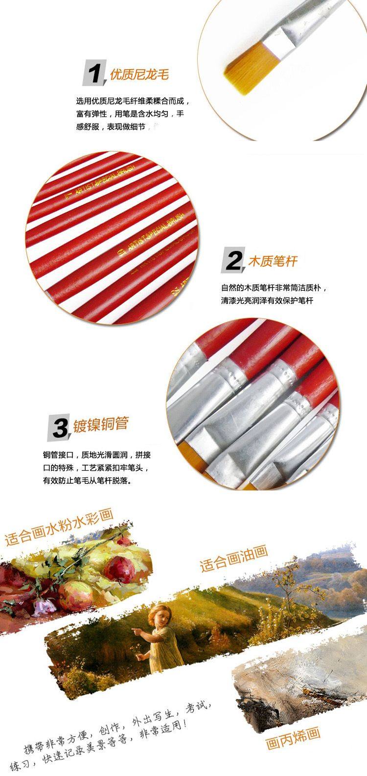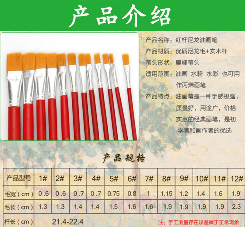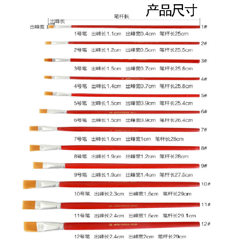 1# кисть шириной 5,5 мм ×1, 2# кисть шириной 6,0 мм ×1, 3# кисть шириной 6,5 мм ×1, 4# кисть шириной 7,0 мм ×1, 5# кисть шириной 7,5 мм ×1, 6# кисть шириной 8,0 мм ×1, 7# кисть шириной 10 мм ×1, 8# кисть шириной 12 мм ×1, 9# кисть шириной 13 мм ×1, 10# кисть шириной 14 мм ×1, 11# кисть шириной 16 мм ×1, 12# кисть шириной 20 мм ×1