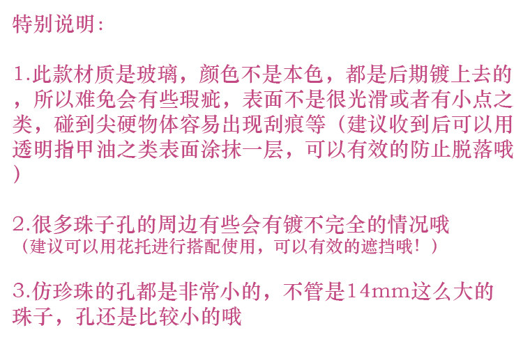 特别提醒:请对照尺子核对尺寸,勿看图购物,3mm的仿珍珠是很小的哦!