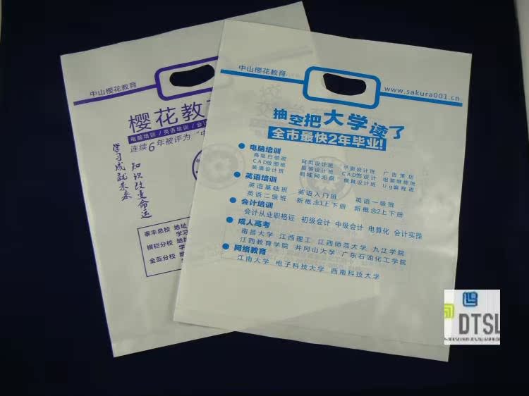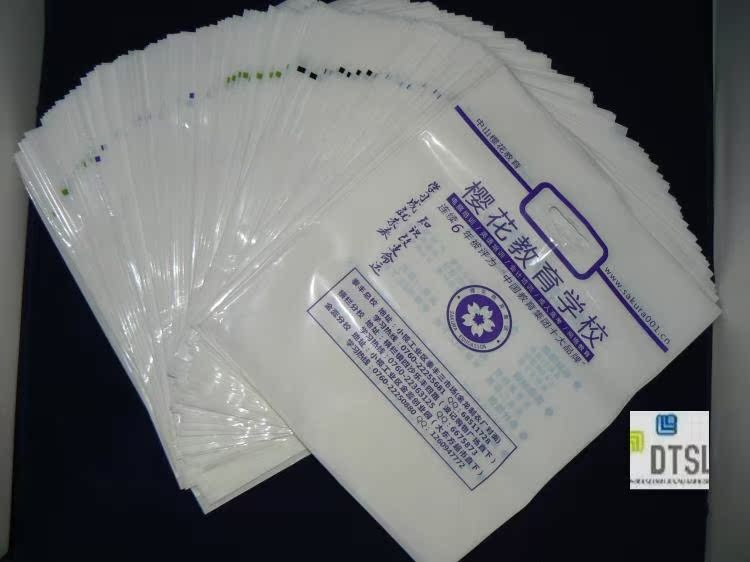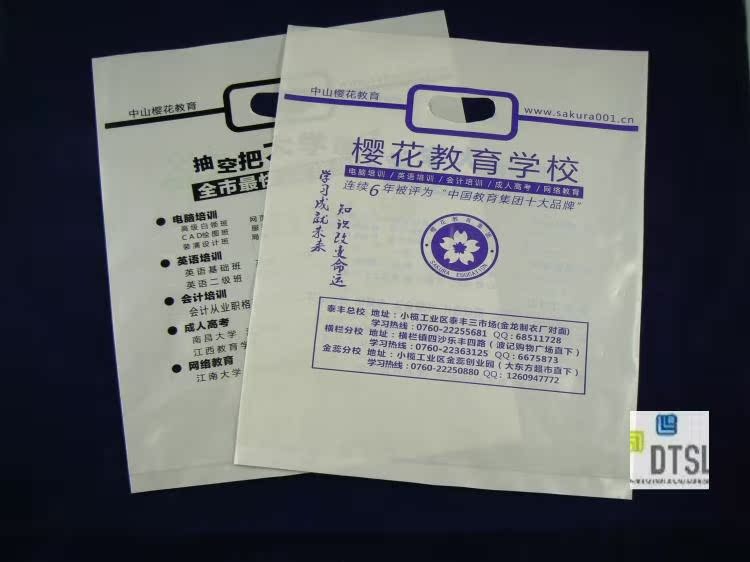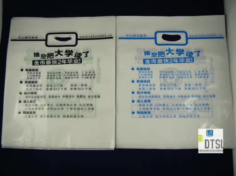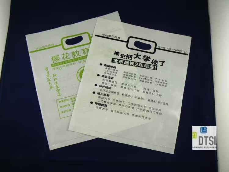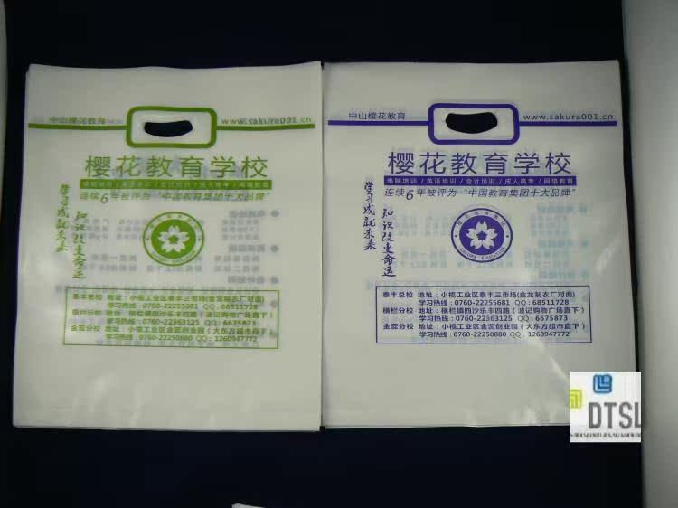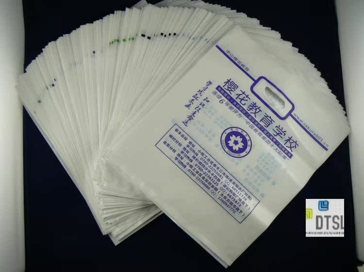 图中袋子是我厂为樱花教育学校生产,材料为高压料(PE-LD) 软材料. 28厘米宽*33厘米高度,双层厚度16丝,单面8丝(属于加厚) 5000个起做 双面单色铜版印刷5000只2450元(如上面图片)。如果选择单面单色(就是印刷一面,另一面是空白的)印刷需要2100元(5000个)