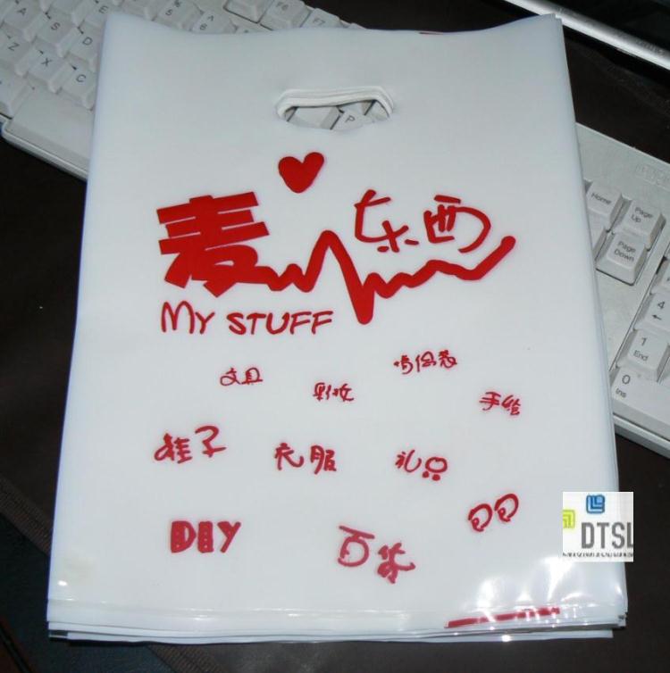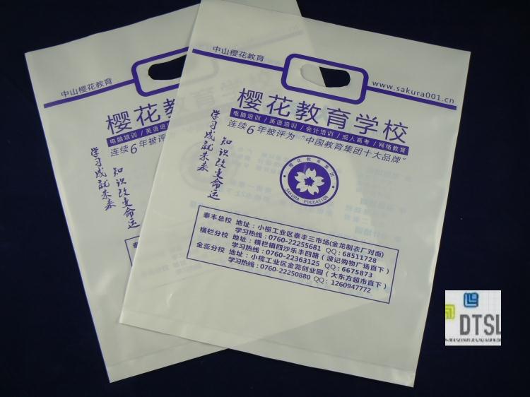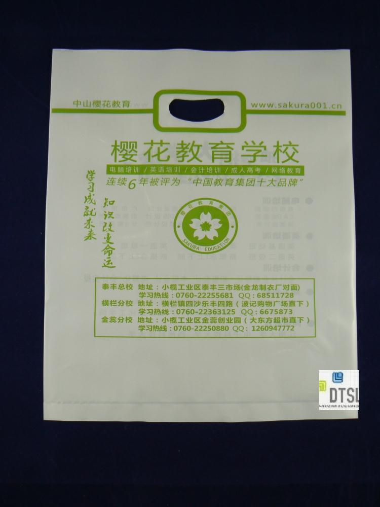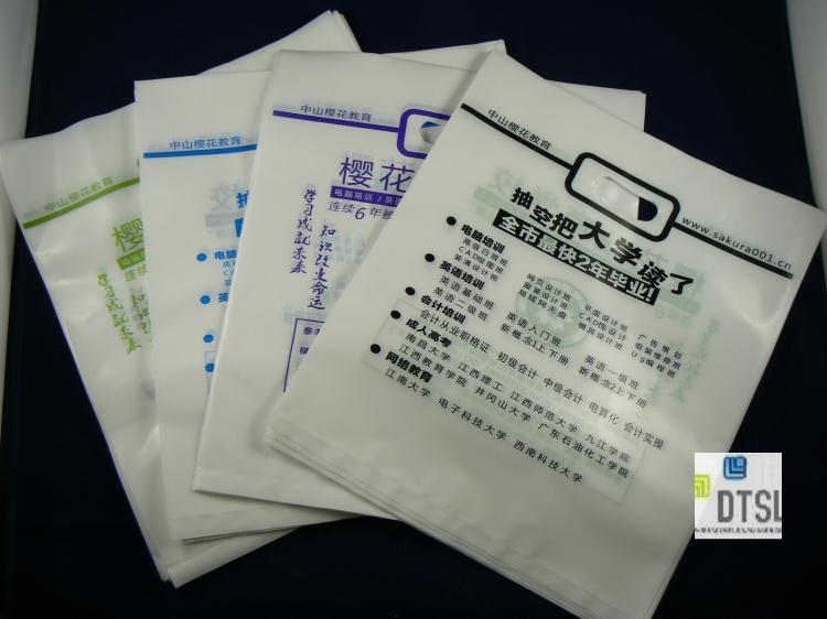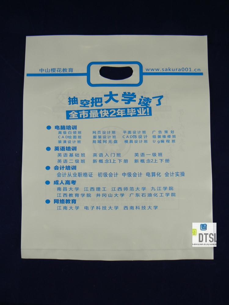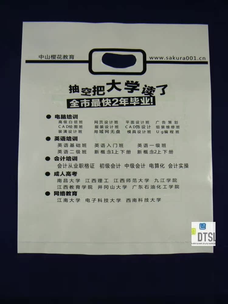 图中袋子是我厂为樱花教育学校生产,材料为高压料(PE-LD) 软材料. 28厘米宽*33厘米高度,双层厚度16丝,单面8丝(属于加厚) 5000个起做 双面单色铜版印刷5000只2450元(如上面图片)。如果选择单面单色(就是印刷一面,另一面是空白的)印刷需要2100元(5000个)