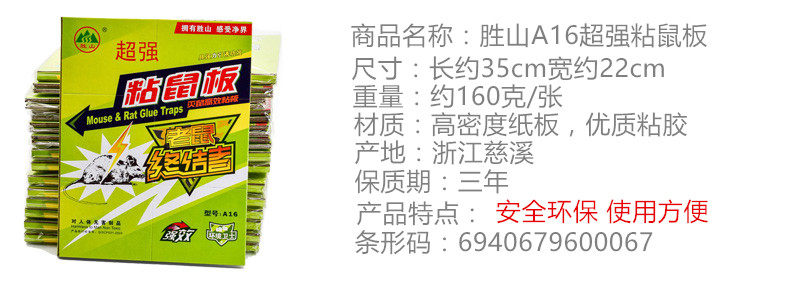 本款为胜山A16型强力粘胶,胶水含量约达35克,没毒无害,安全卫生,使用方便,为理想捕鼠用具,胜山品牌专业生产20年。