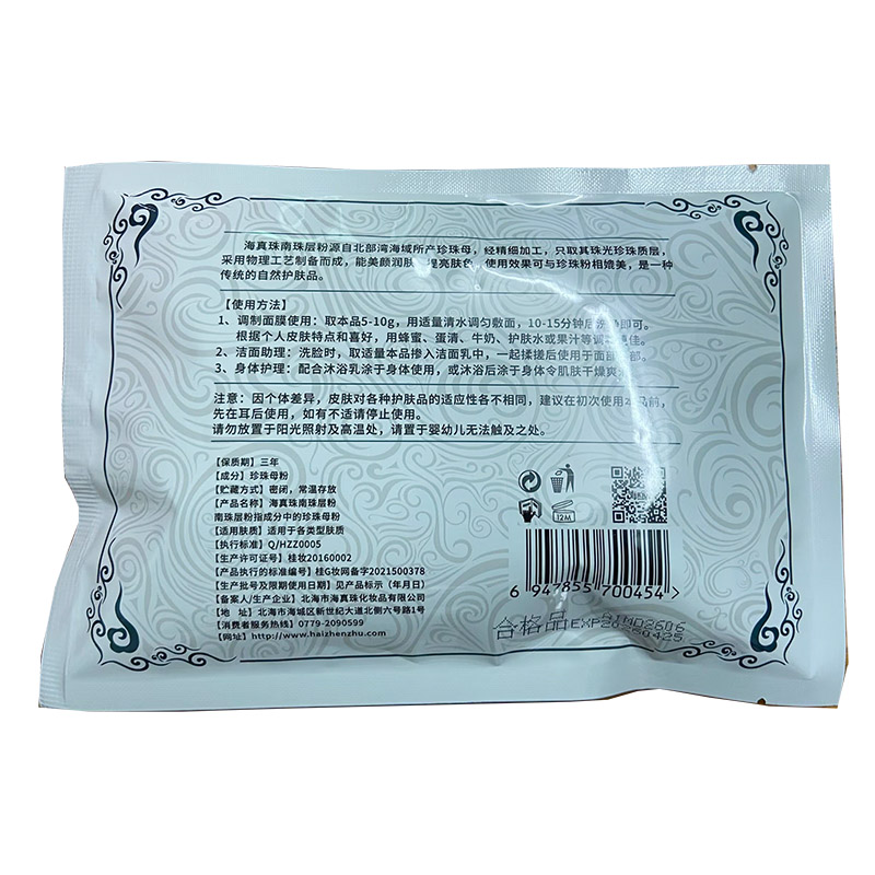 海真珠南珠层粉源自北部湾海域所产珍珠母,经精细加工,只取其珠光珍珠质层,采用物理工艺制备而成,能美颜润肤,提亮肤色,使用效果可与珍珠粉相媲美,是一种传统的自然护肤品。