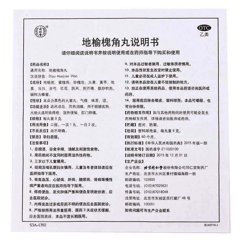 Пилюли Тунжэньтан Ди Юй Хуайцзяо 10 пилюль для устранения ветра и сухости, охлаждения крови, при влажно-жгучих геморроях, кровотечении, запорах и опухоли анального отверстия