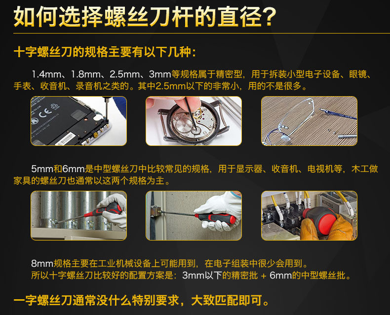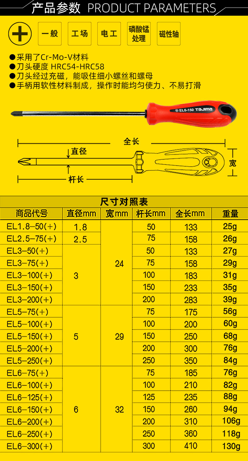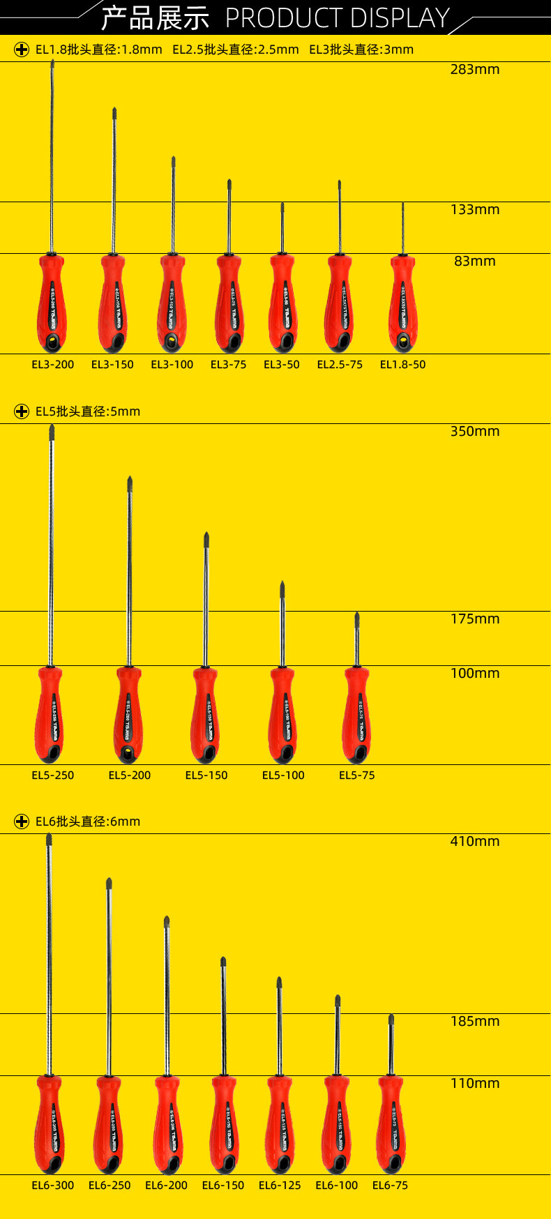 | Цветовые варианты | 1.8×50мм (длина 133мм), 2.5×75мм (длина 158мм), 3×50мм (длина 133мм), 3×75мм (длина 158мм), 3×100мм (длина 183мм), 3×150мм (длина 233мм), 3×200мм (длина 283мм), 5×75мм (длина 175мм), 5×100мм (длина 200мм), 5×150мм (длина 250мм), 5×200мм (длина 300мм), 5×250мм (длина 350мм), 6×75мм (длина 185мм), 6×100мм (длина 210мм), 6×125мм (длина 235мм), 6×150мм (длина 260мм), 6×200мм (длина 310мм), 6×250мм (длина 360мм), 6×300мм (длина 410мм), Набор отверток с быстросъемным механизмом и плоскогубцами |