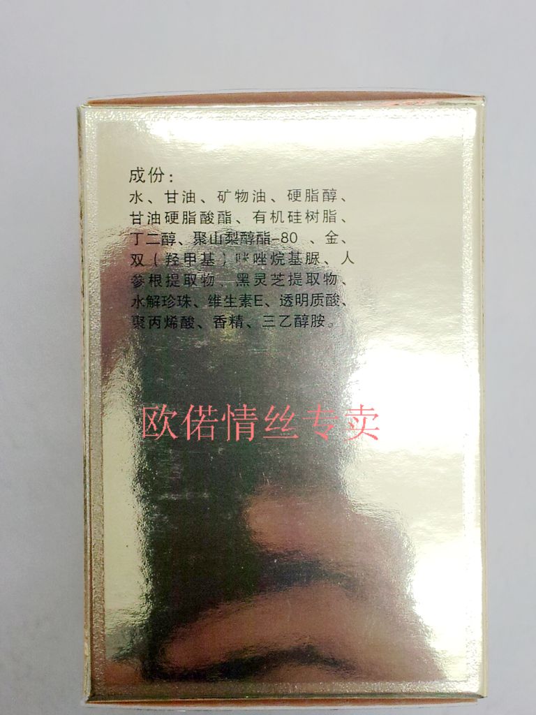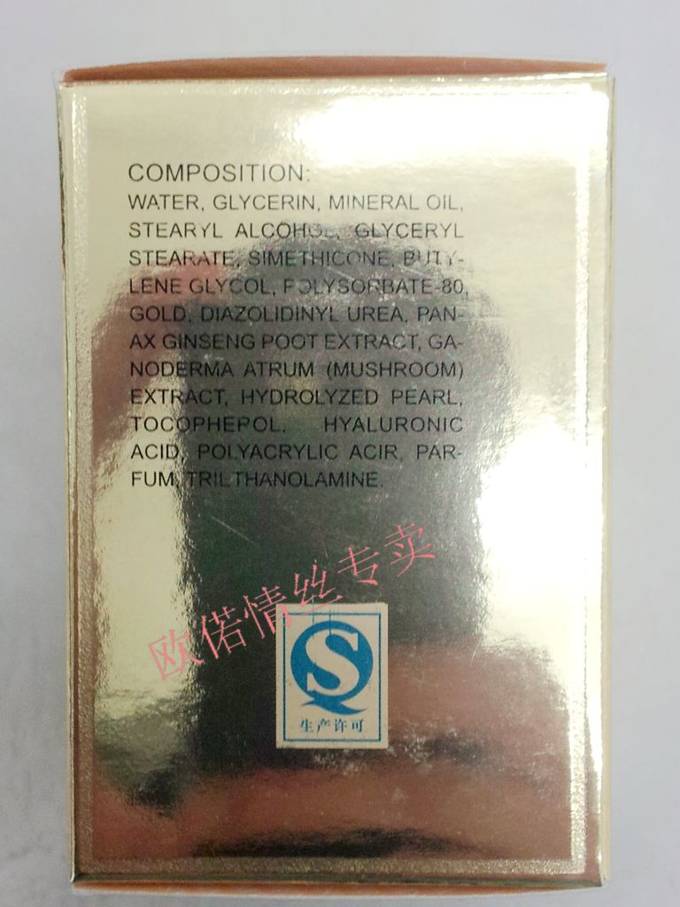 本品含活性金,珍珠,透明质酸,维生素E,人参,灵芝提取物。