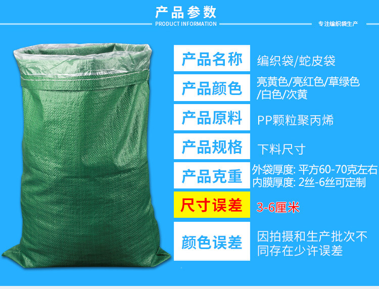 注明:内膜(内胆):外面是普通的蛇皮袋,里面加一层单独的塑料袋.是两个袋,内胆防水效果好些,适合装柔性的衣服类,粉末.防水效果还是可以的。