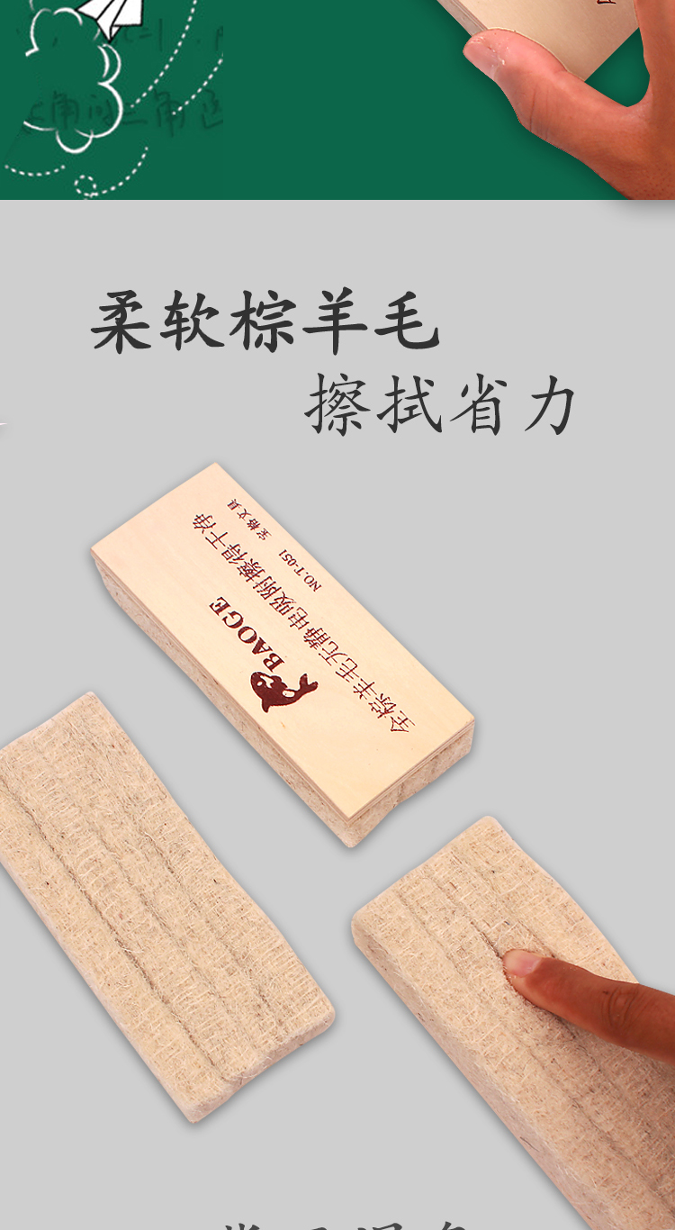 亲们,请留意,此款全棕羊毛板擦,多适用于学校或者家用漆面黑板的,一般家用的双面板,绿色板面书写的粉笔字,使用此款板擦擦拭,粉笔印迹会有残留的,是绿色板面原因,非商品板擦质量问题的!绿色板面书写的粉笔字,想要完全擦拭干净,不留印迹,一般都是湿擦的!