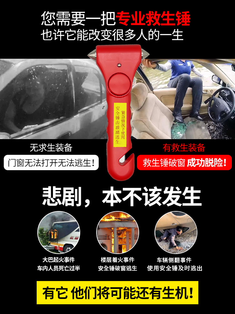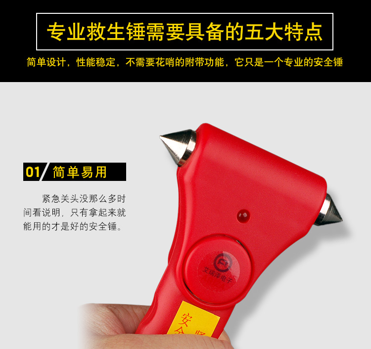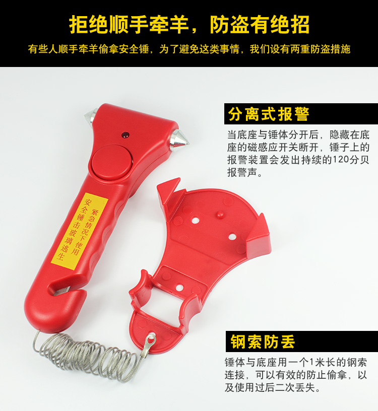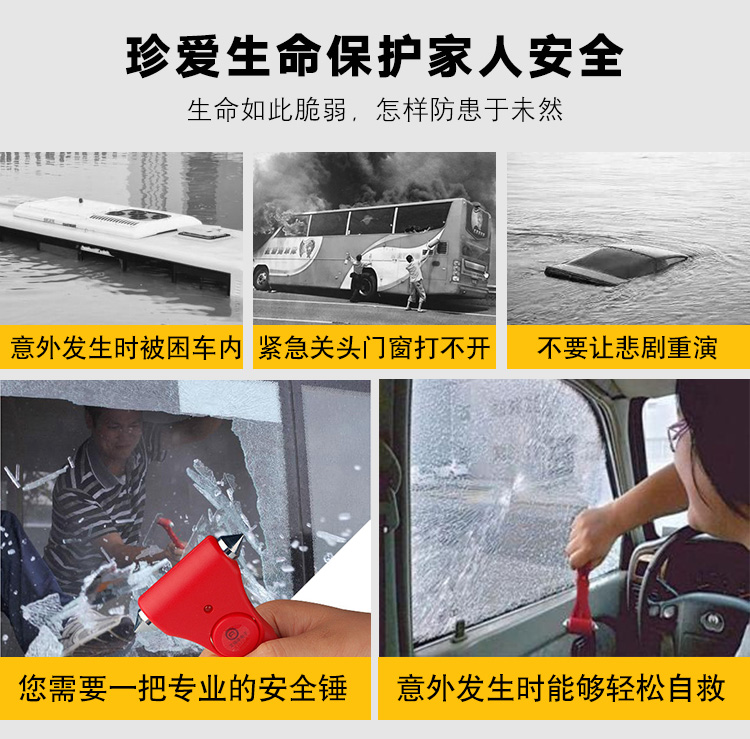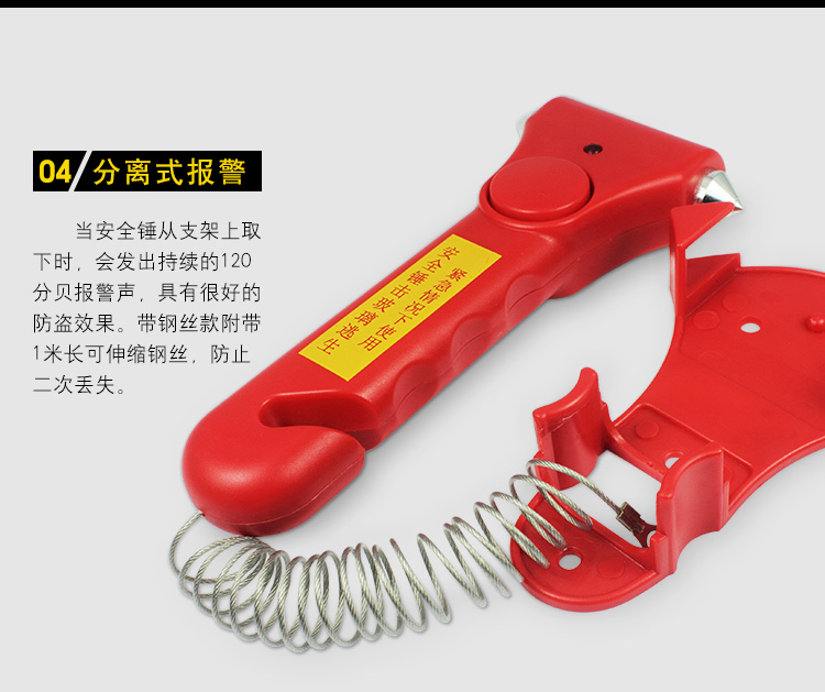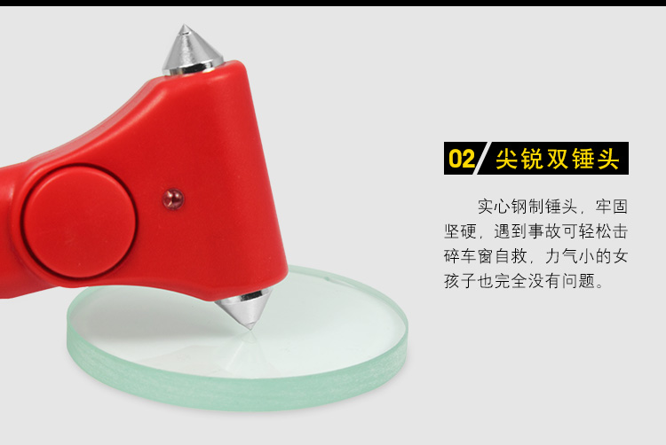 专家提示:安全锤可增加5%的逃生几率!这是一款车用应急安全锤,可以安放在汽车座位和车窗旁。良好的手柄设计,当在出现意外的时候可以最大力度的敲碎玻璃,割断汽车保险带,不但提高了行车的安全系数,也是车友的安全用品