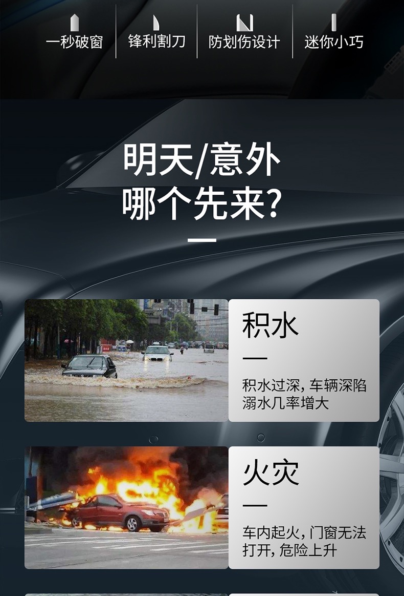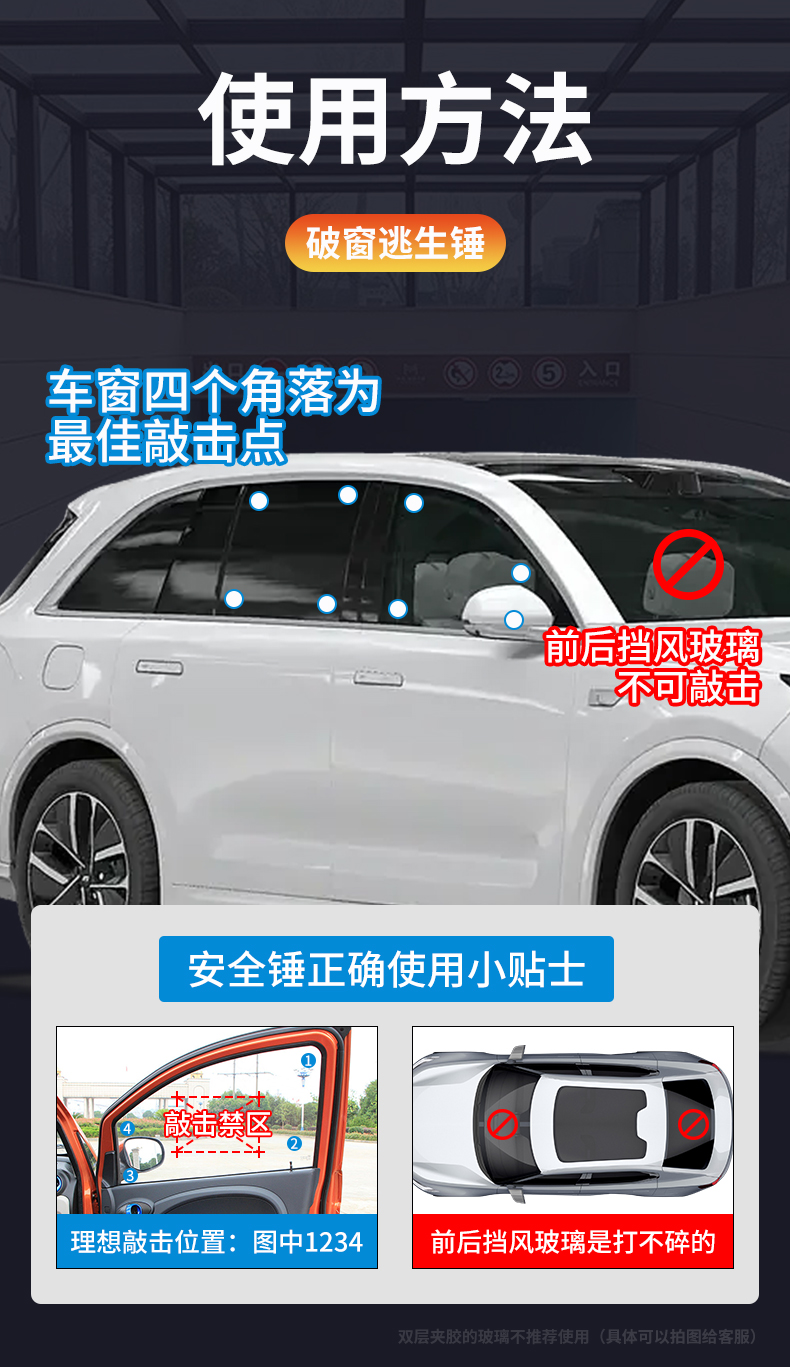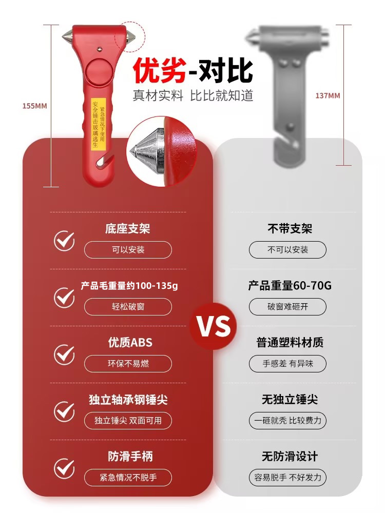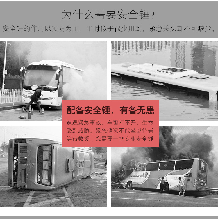 专家提示:安全锤可增加5%的逃生几率!这是一款车用应急安全锤,可以安放在汽车座位和车窗旁。良好的手柄设计,当在出现意外的时候可以最大力度的敲碎玻璃,割断汽车保险带,不但提高了行车的安全系数,也是车友的安全用品