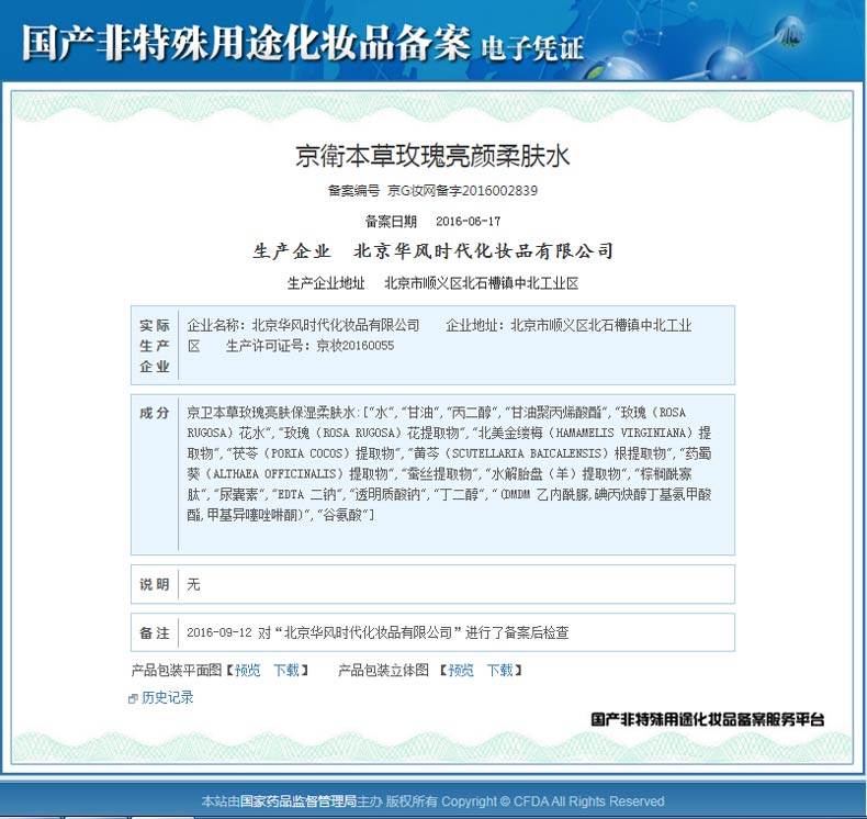 | Номер производственной лицензии | Пекин, лицензия на косметику № 20160055 |