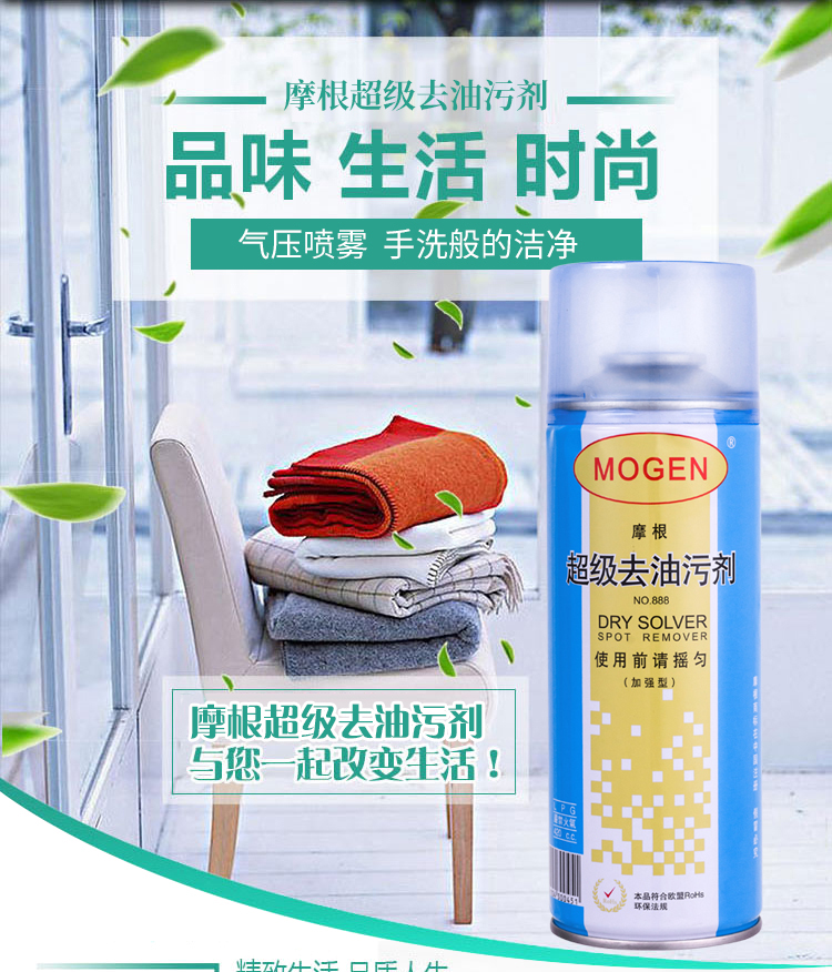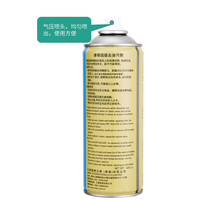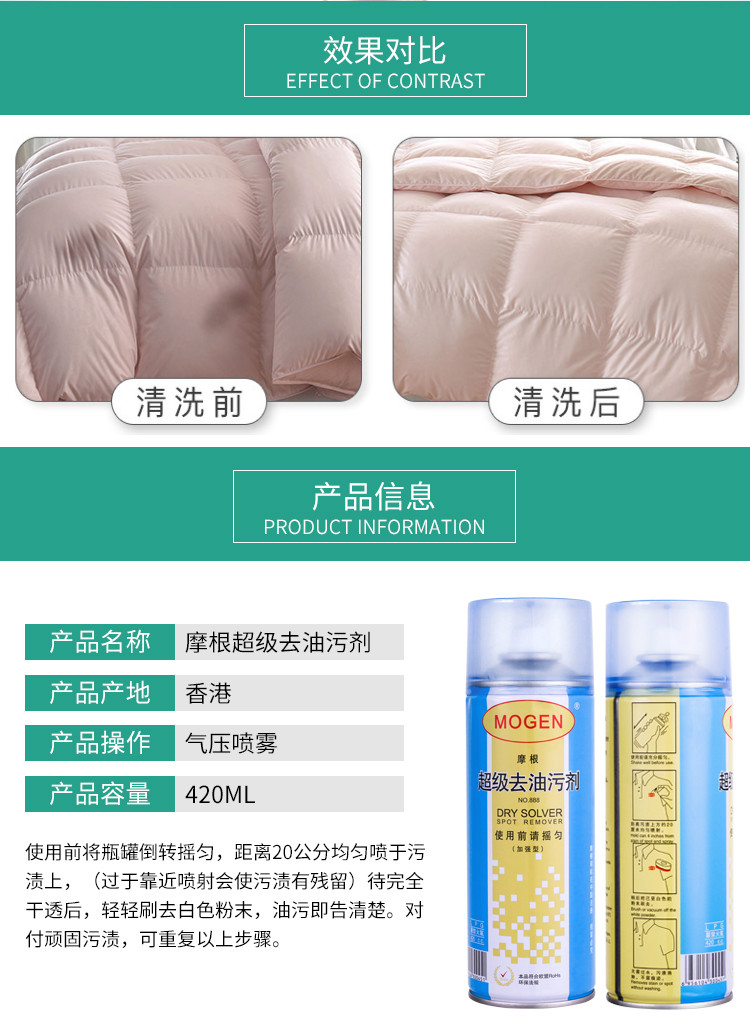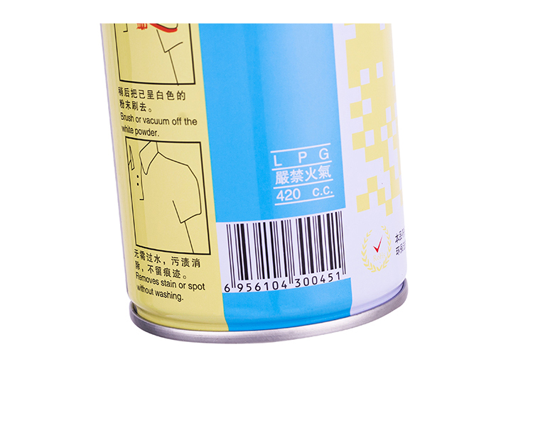 用法:使用前将罐身倒转摇匀(摇匀标准:听见内装玻璃珠声响),距离15公分均匀喷于污渍上。