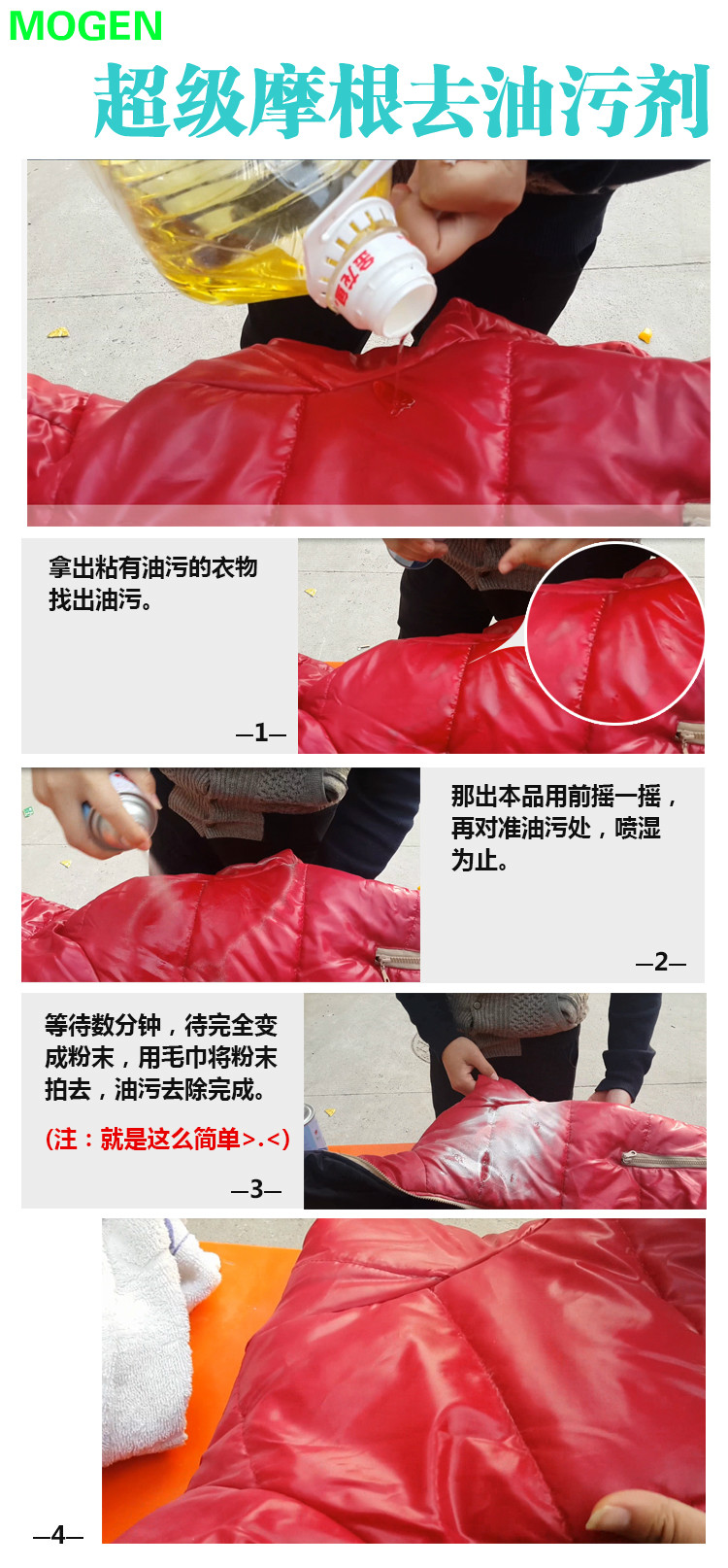 | 油渍都有它的特殊性,同样的油渍弄在不同的衣服上、时间的长短、曾经用什么材料处理过等等,这些都会影响处理效果的。有的可以去净,有的只可以驱除一点,有的甚至是去不掉(效果怎么样是油渍或其它多种原因所决定的)此款产品只能去轻油污就是刚刚弄上去那种油渍,长时间那种油污跟去污渍效果一般,有什么不明白地方可以咨询在线客服 | |