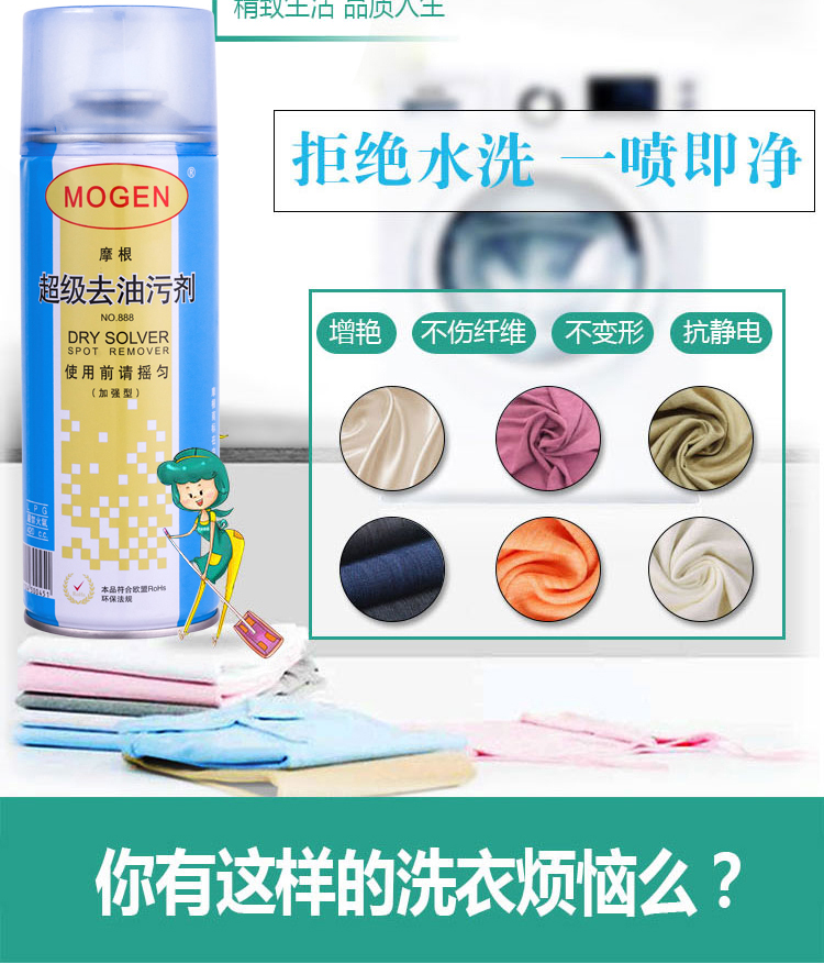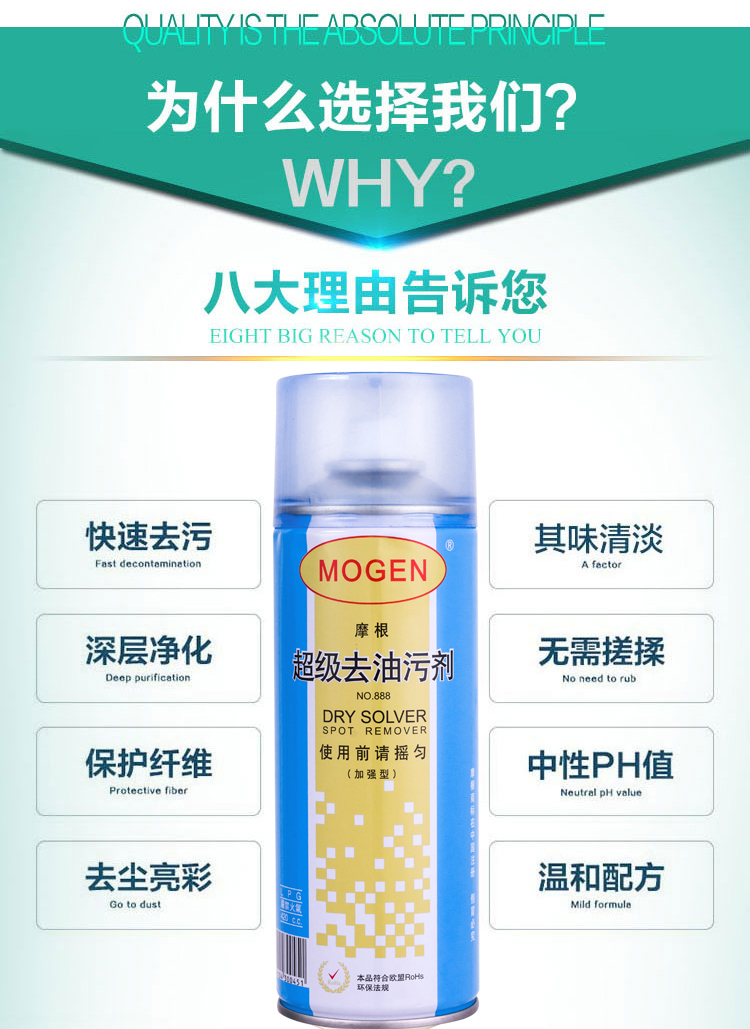 特点:彻底清除纤维纺织品上的油渍斑点,快捷有效,并且符合环保要求,绝不污染环境。