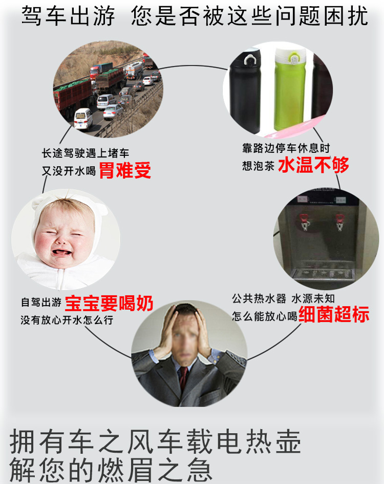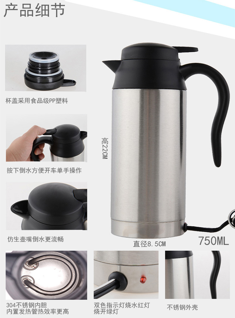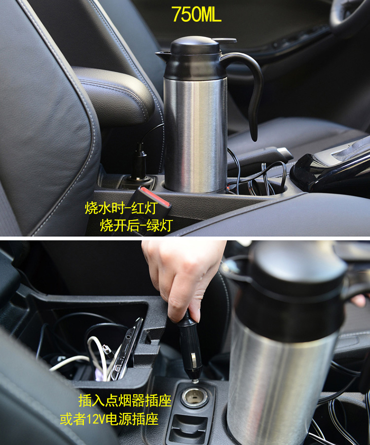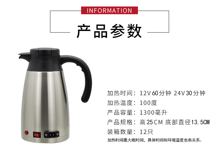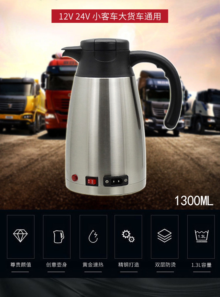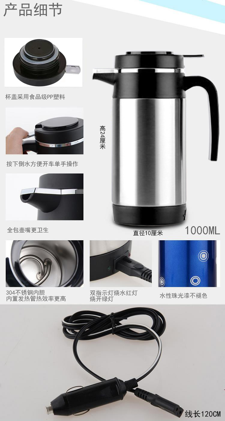 欢迎光临:小汽车(车上一块电瓶)选12V,大货车(车上两块电瓶)选24V,小汽车大货车都要用请选带通用两个字的选项。 特别提醒:点烟器盖子上面有标12V120W、12V180W、24V300W、24V15A的可以直接用。个别车点烟器孔带不动烧水壶,收到不能用的(比如指示灯亮一下就灭了)请联系壶底售后电话提供解决方法。东风车使用请先联系客服沟通后购买。750ML装一瓶矿泉水,1000ML装一瓶半矿泉水。小车烧一瓶矿泉水30分钟左右,大货车烧一瓶矿泉水15分钟左右。所有烧水壶不插电都不保温。产品保修一年,干烧加热管变色或烧壶盖不保修,车点烟器孔变色烧坏壶插头不保修。海拔超过500米的高原地区烧开不会自停请拔掉插头。支持7天无理由免费退换货(送退货运费保险)。未确定使用前所有包装配件请保存好。