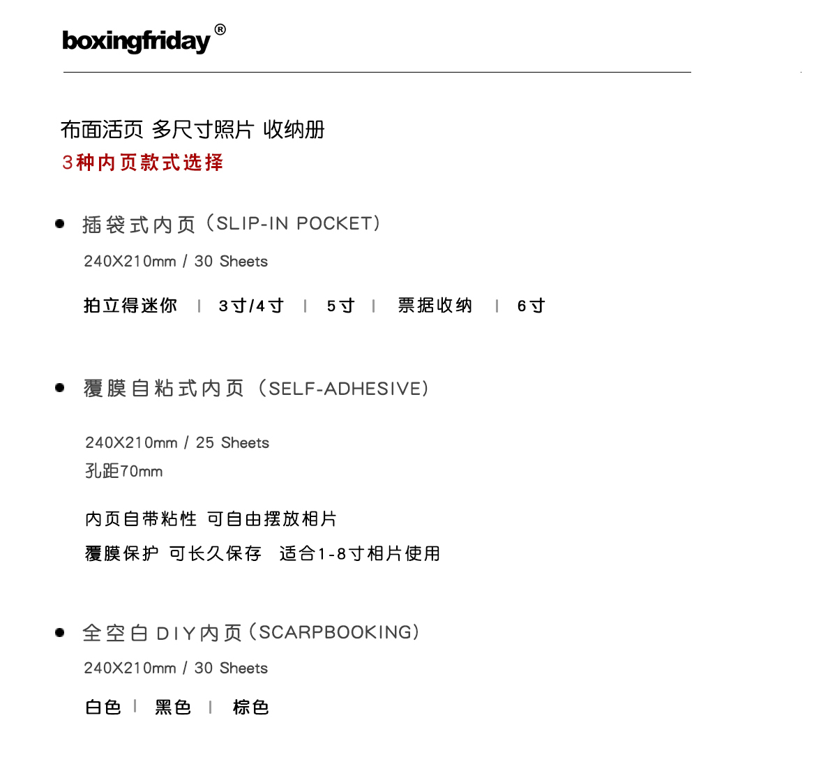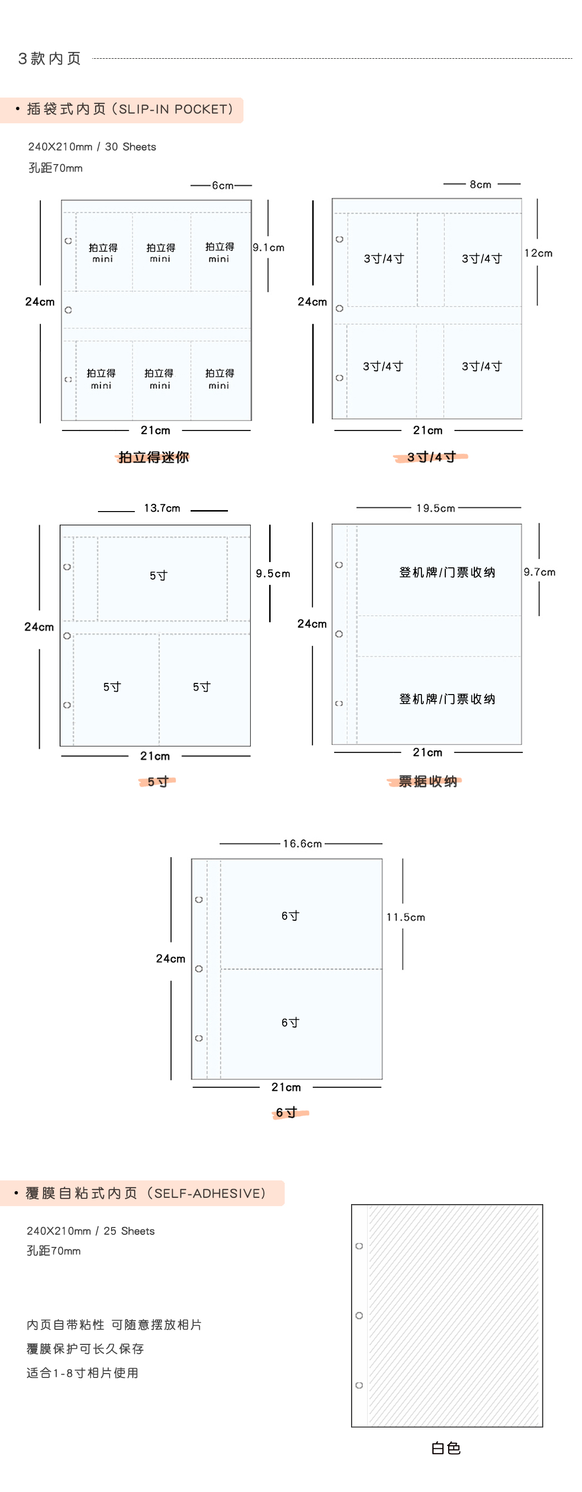 | Количество страниц | 30 вкладышей с карманами | 3" | Вместимость 360 фото | С полосками для подписей; 30 вкладышей | 4" | Вместимость 240 фото | С полосками для подписей; 30 вкладышей | 5" и wide | Вместимость 180 фото | Без полосок для подписей; 30 вкладышей | 6" | Вместимость 120 фото; 30 вкладышей | Для хранения квитанций | С полосками для подписей; 30 листов DIY из белого плотного картона | Без клея; 30 листов DIY из коричневого плотного картона | Без клея; 30 смешанных страниц | Укажите стиль и количество при заказе; 40 смешанных страниц | Укажите стиль и количество при заказе; 25 ламинированных самоклеящихся страниц | Белые | С клеем |