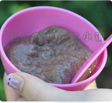 2、加温热的水(或者根据亲喜欢加丝瓜水等调),加水量是四大勺(海藻与水的比例1:4)