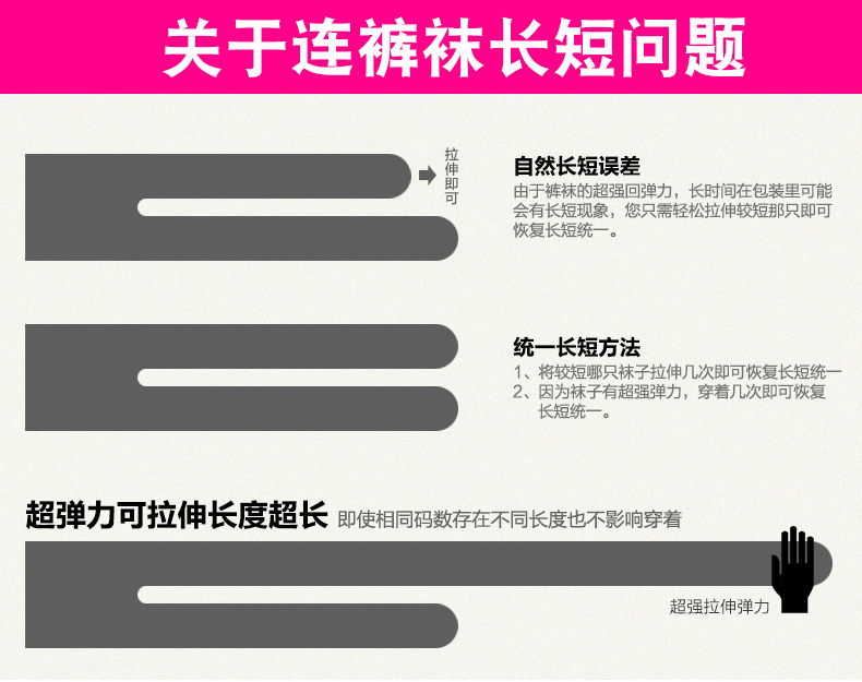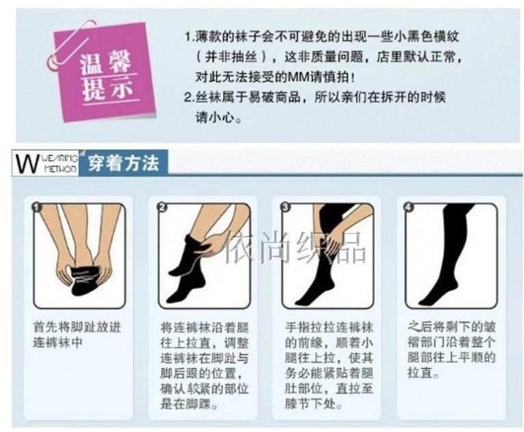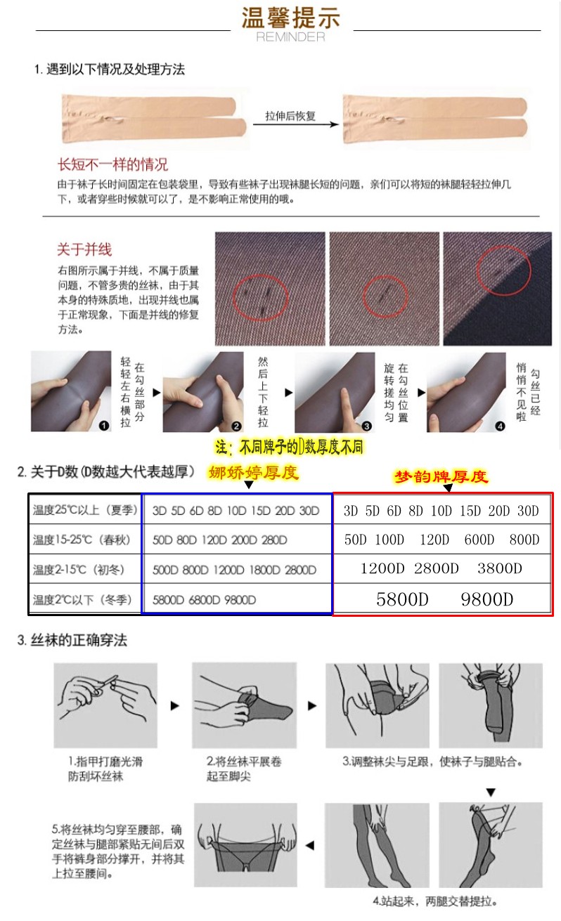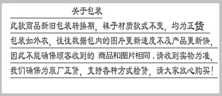 包装:每一双都是独立包装 有穿过的朋友会知道它的质量。没穿过的朋友,请留意,此款丝袜属于普通丝质,是老款式的丝袜,所以对于高要求的朋友,请慎拍。一分钱一分货,永是真理!所以,如以质量差、感觉不好之由申请退货的,均拒绝!