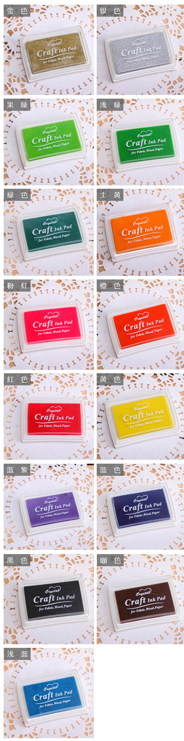 | Цветовые варианты | Жёлтый, Красный, Золотой, Серебряный, Зелёный, Синий, Чёрный, Коричневый градиент, Набор из 6 цветов (градиентные штемпельные подушки), Набор из 15 цветов (однотонные штемпельные подушки), Розовый, Зелёный градиент, Оранжевый градиент, Яблочно-зелёный, Светло-голубой, Коричневый, Розовый градиент, Сине-фиолетовый, Оранжевый, Светло-зелёный, Фиолетовый градиент, Земляной жёлтый, Синий градиент |